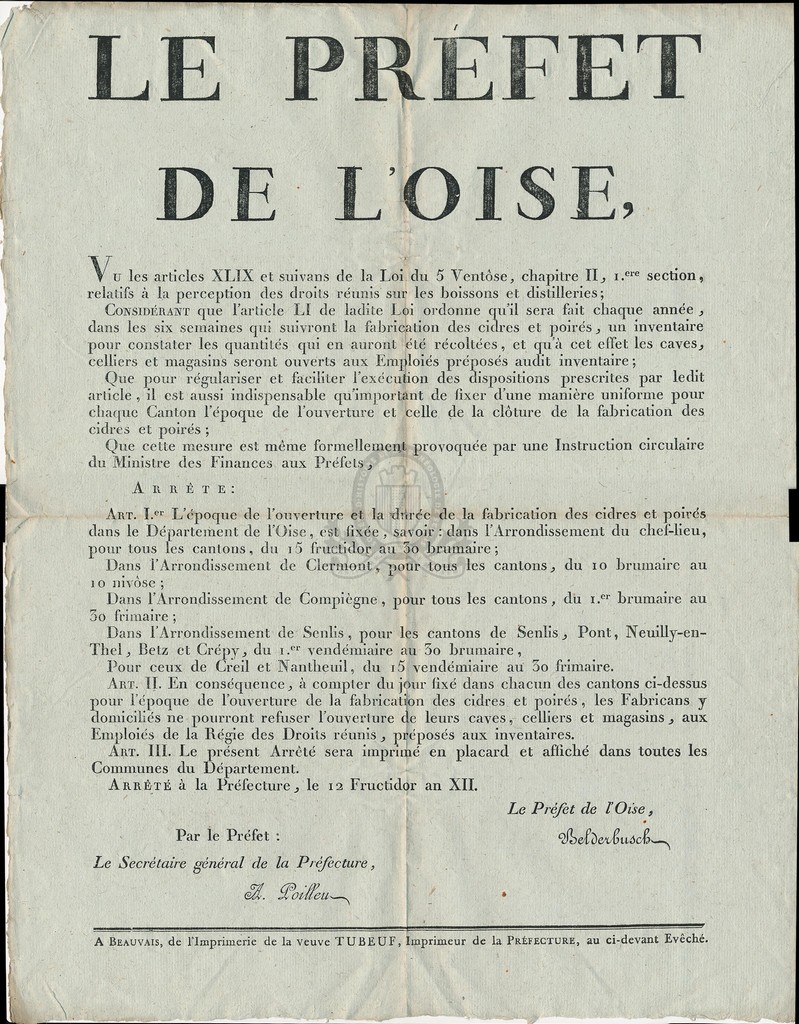 [2 - Thésaurus Brunet-Parguez ] Sciences et Arts:Sciences physiques et chimiques:Chimie appliquée:Distillation des alcoolsPermalink : ./index.php?lvl=notice_display&id=8383 Arrêt du Préfet de l'Oise fixant l'époque de l'ouverture et la durée de la fabrication des cidres et poirés dans le département de l'Oise pour chaque arrondissement : [placard] [texte imprimé] / Préfecture (Oise), Éditeur scientifique ; Charles Léopold von Heydes de Belderbusch (1749-1826), Signataire ; Marie-Porcienne Tubeuf (17..-18..), Imprimeur . - A Beauvais : de l'imprimerie de la veuve Tubeuf, [s.d. (1804)] . - 1 f. ; 45 x 35 cm.