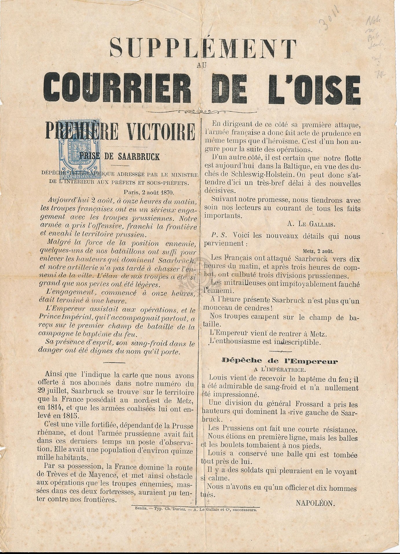 [1 - Thésaurus UNESCO ] Information et communication:Industries de l'information:Presse:Presse générale et politiqueCote : MACPA Tiroir 2 Centre Permalink : ./index.php?lvl=notice_display&id=9380 Supplément au Courrier de l'Oise - Première victoire : prise de Saarbrück / Armand Le Gallais ([s.d. (1870)])