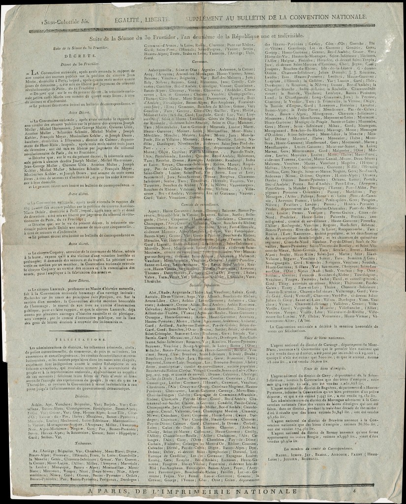 I - Sans-Culottide bis - Suite de la séance du 30 fructidor, l'an deuxième - Supplément au Bulletin de la Convention Nationale [texte imprimé] . - 1794 . - 1 f. ; 50 x 41 cm. Langues : Français ( fre)