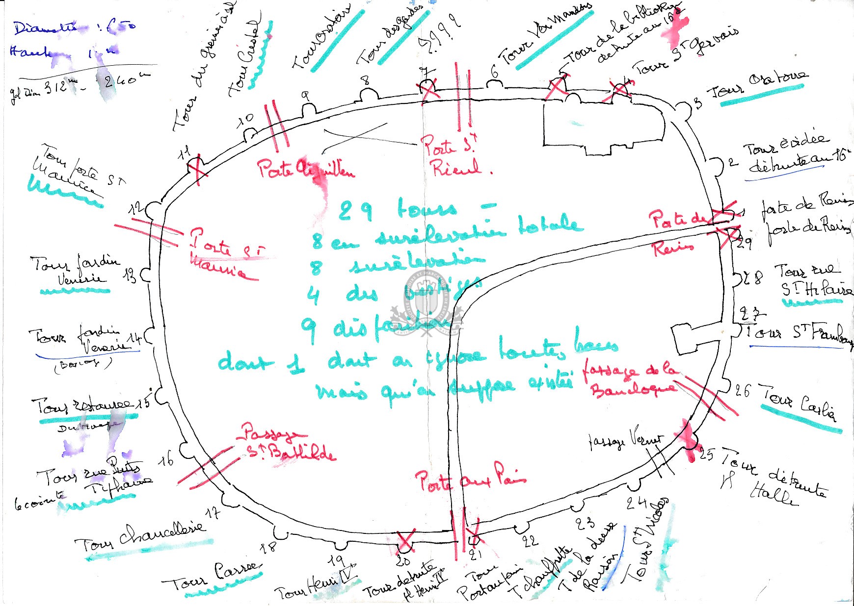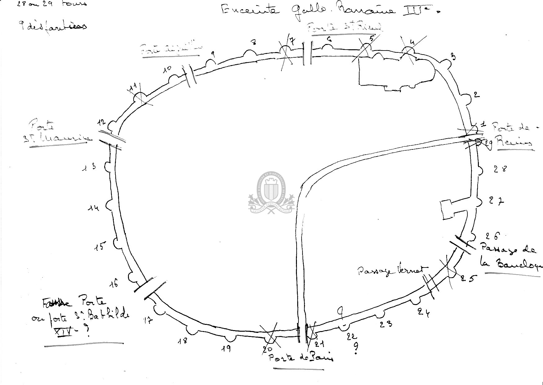 - 2 plans ms A4 de l'enceinte du 3e siècle portant l'emplacement et le nom des 29 tours. |