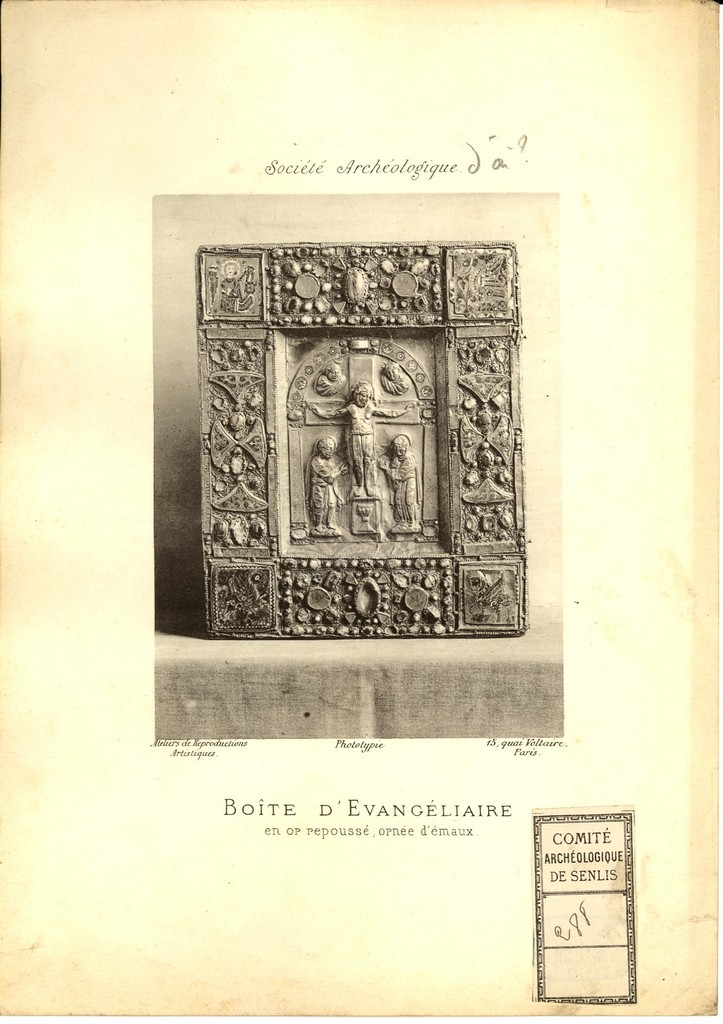 Titre : Boîte d'évangéliaire en or repoussé, ornée d'émaux Type de document : document graphique à deux dimensions Editeur : Paris : Ateliers de reproductions artistiques Année de publication : [s.d. (ca 1900 ?)] Importance : 1 phototypie Format : 13 x 10 cm (24 x 17 cm) Note générale : Extr. d'un ouvrage. Au dessus de la photo : Société archéologique.