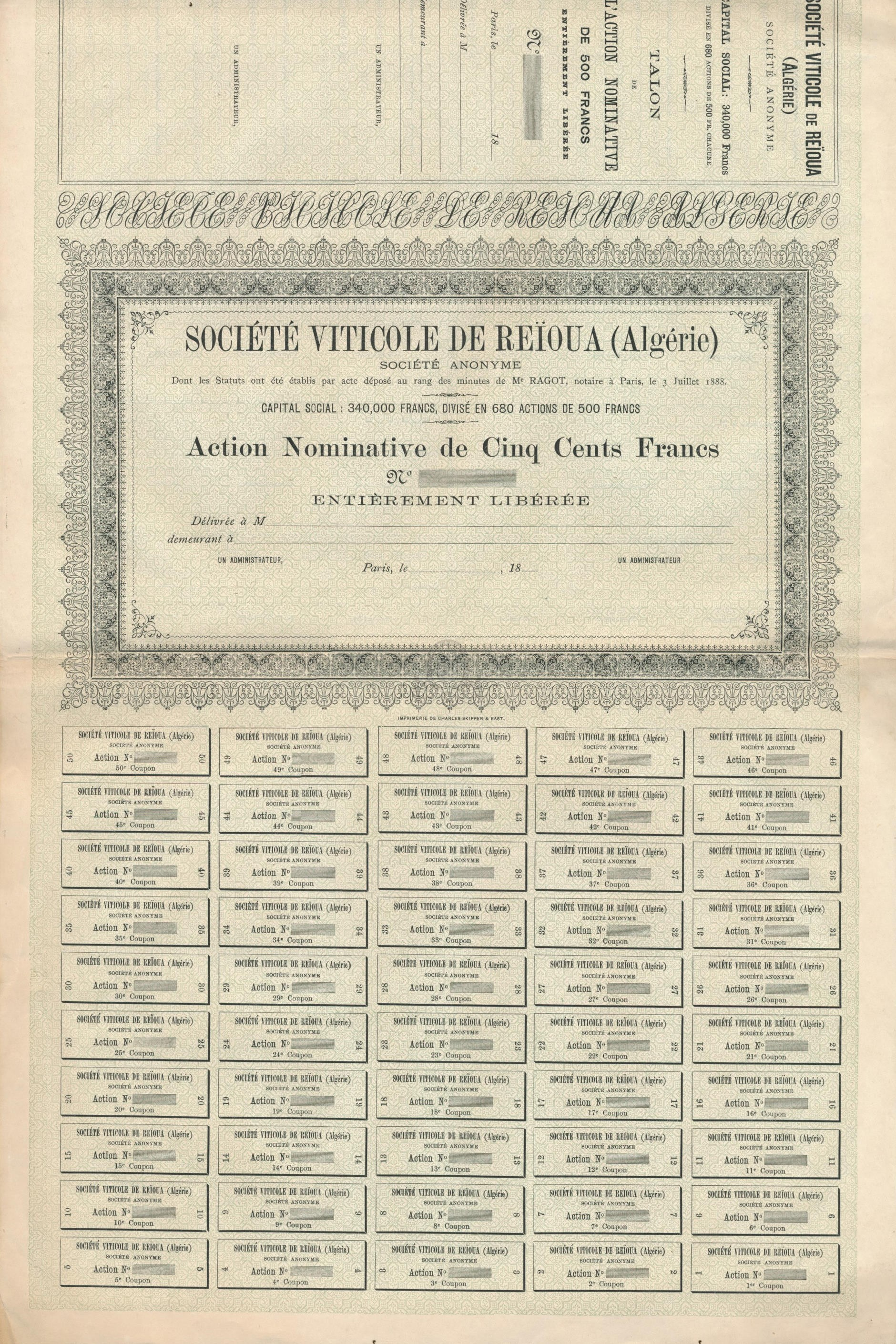 Exclu du prêtArchives Bt 340 (FP094) Action nominative de cinq cents [500] francs et coupons de dividende émis par la Société viticole de Reïoua (Algérie) / Société viticole de Reïoua (Algérie) ([s.d. (aps 1888)])