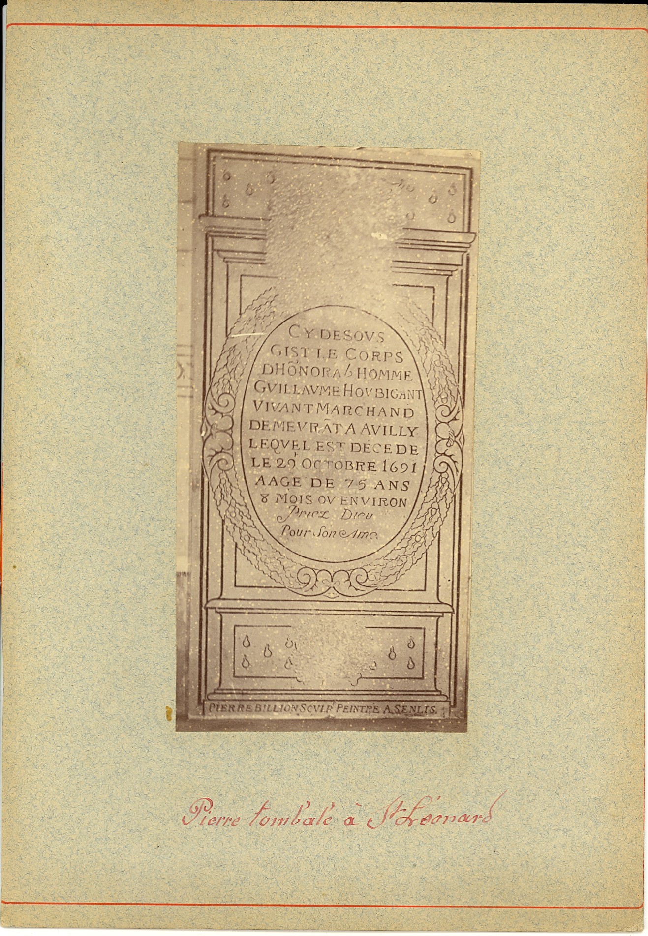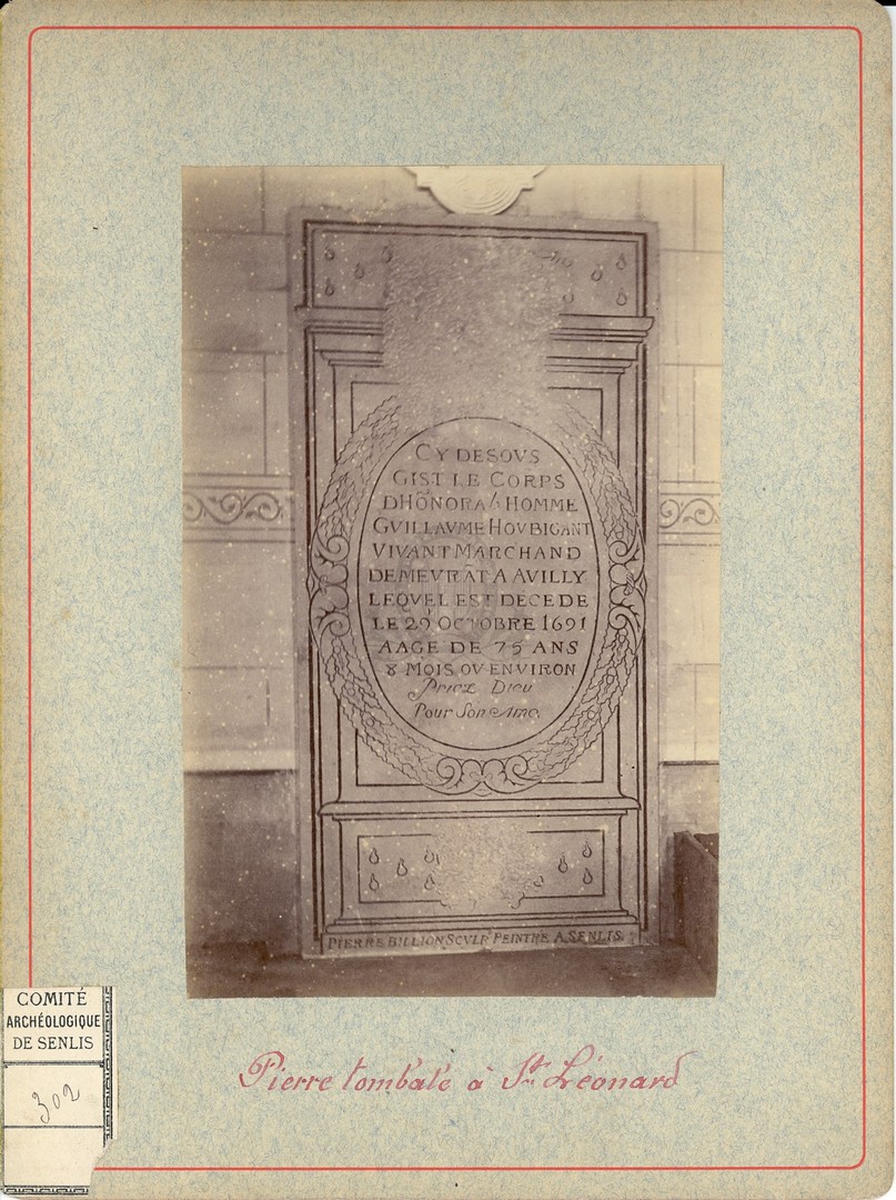 Pierre tombale de Guillaume HoubigantURLL'église de Saint Léonard : pierre tombale de Guillaume Houbigant, décédée en 1691, réalisée par Pierre Billion sculpt. peintre à Senlis ([s.d. (avt 1914)])
