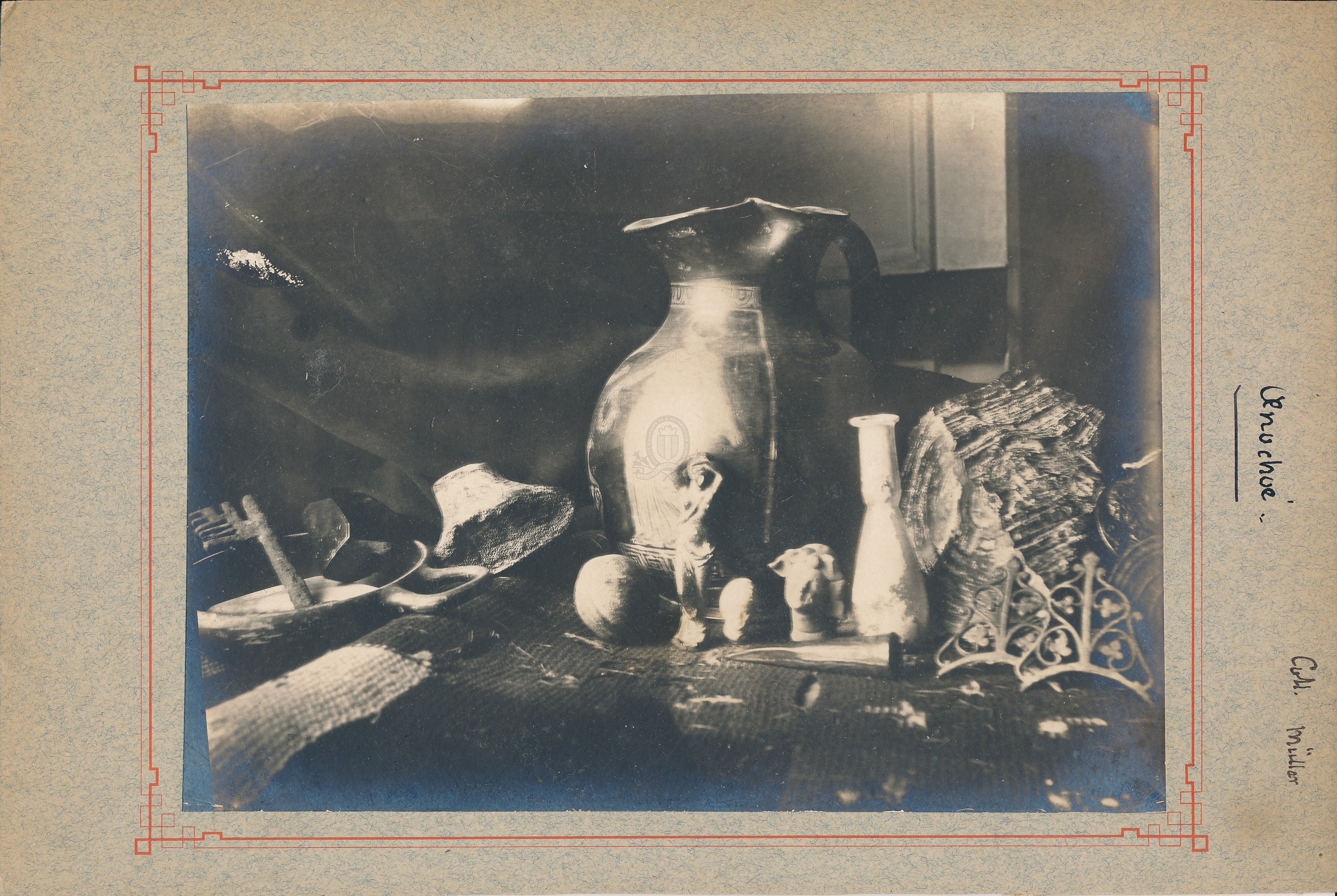 [3 - Thèmes locaux] Noms communs ou Sujets:C... (Camp à Cyclisme):Collections archéologiquesIndex. décimale : 738.3 Faïence, grès Forme de la ressource : Dessin Permalink : ./index.php?lvl=notice_display&id=20485 Collection Müller. 5 objets dont 1 œnochoé et dessin de l'illustration du vase [document graphique à deux dimensions] / Eugène Müller (1834-1918), Illustrateur . - [s.d. (avt 1914)] . - 1 épreuve photographique sur papier + 1 dessin à la plume, encre noir sur papier pelure contrecollé sur du papier quadrillé et l'ensemble contrecollé sur carton : ill. en noir et blanc ; 9 x 12 cm, 12.5 x 16 cm (24 x 17 cm).
