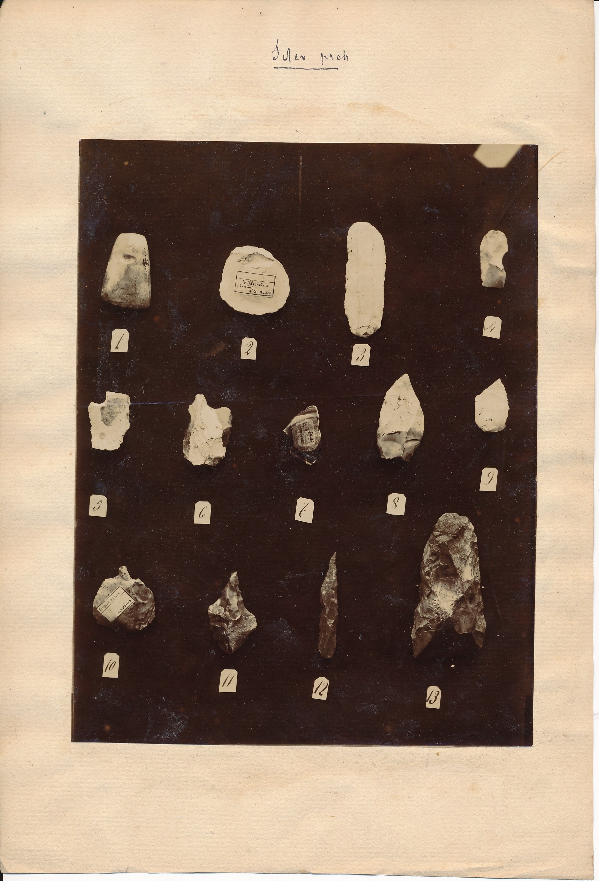 Titre de série : Collection Müller Titre : Différents artefacts en silex Type de document : document graphique à deux dimensions Auteurs et Fonctions : Eugène Müller (1834-1918), Photographe Année de publication : [s.d. (avt 1914)] Importance : 1 épreuve photographique sur papier contrecollée sur papier au recto et 1 dessin, crayon de bois, contrecollé sur la même feuille, au verso Illustrations : ill. en noir et blanc Format : 16 x 12.5 (23.5 x 16 cm) Note générale : Le dessin s'accompagne d'une légende : Villemétrie Langues : Français (fre) Sujets : [3 - Thèmes locaux] Noms communs ou Sujets:C... (Camp à Cyclisme):Collections archéologiques