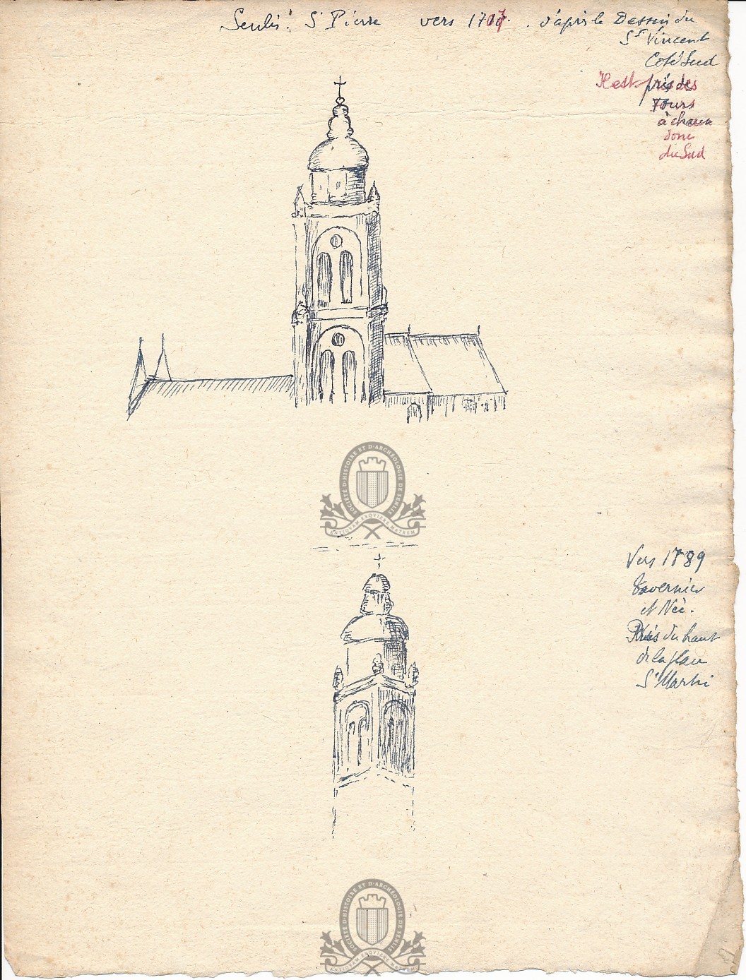 2 - Dessin de Saint-Pierre vers 1707 d'après le dessin du sieur Vincent : coté sud + Dessin du clocher de Saint-Pierre d'après Tavernier et Née, vers 1789URL![]()