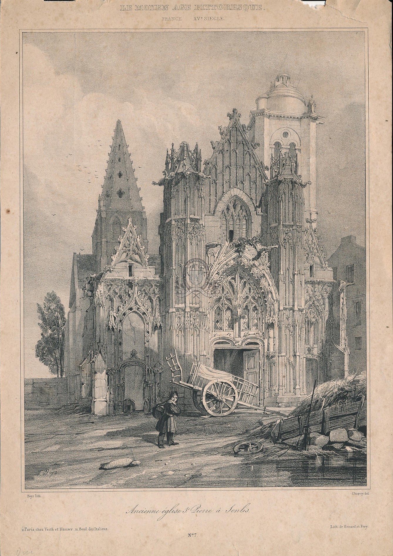 5 - Gravure de l'ancienne église St Pierre à Senlis extr. de : Moyen Age pittoresque, nonumens d'architecture, meubles et décors du Xe au XVIIe siècle... vues dessinées d'après nature par Chapuy... Avec un texte archéologique, descriptif et historique, par M. Moret. - Veith et Hauser, 1837-1840.