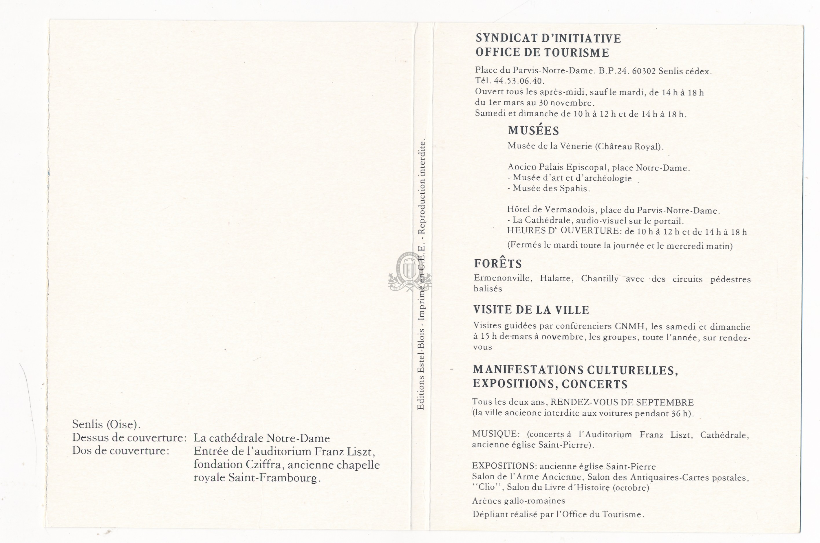 4e de couv. : Ancienne chapelle royale Saint-Frambourg - Entrée de l'auditorium Franz Liszt, Fondation CziffraForme de la ressource : Image Fonction : Plaquette touristique Permalink : ./index.php?lvl=notice_display&id=21082 Senlis - Ville royale Cité romaine [document graphique à deux dimensions] / Syndicat d'initiative de Senlis, Éditeur scientifique . - Blois : Estel, [s.d. (ca 2000)] . - 1 f. de couverture : ill. en coul. ; 15 x 22 cm.