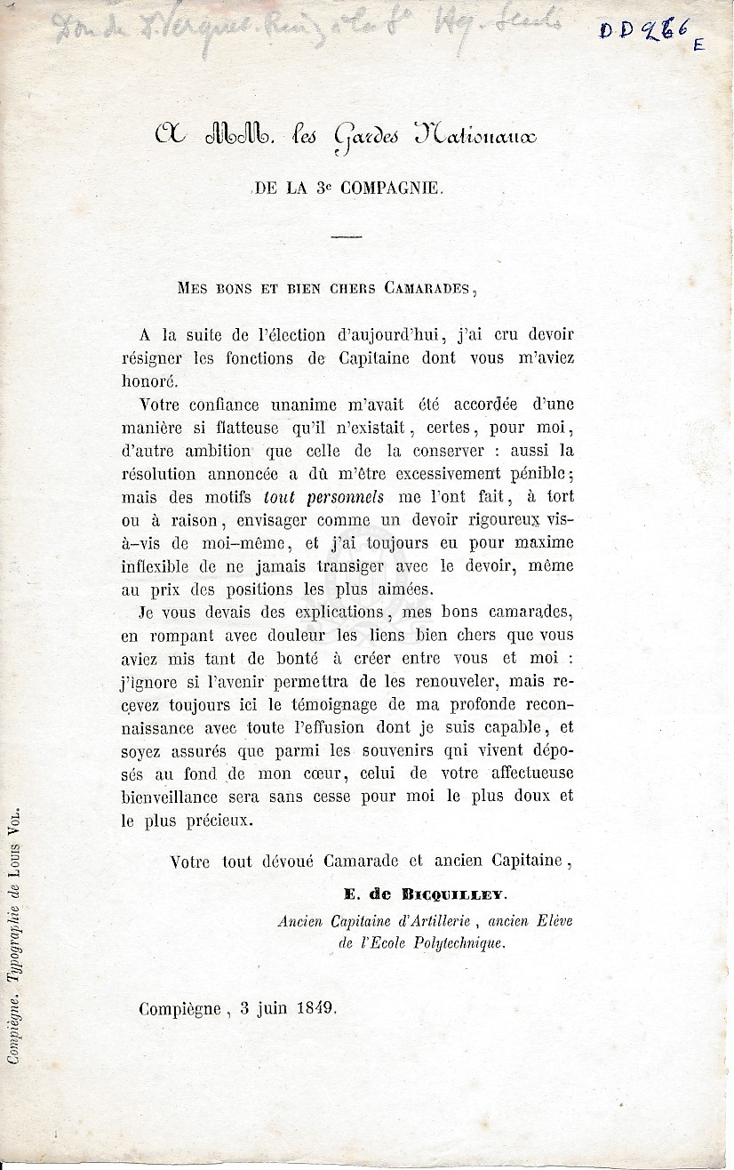 E- Lettre impr. adressée à MM. les Gardes Nationaux de la 3e compagnie par E. de Bicquilley, datée de Compiègne le 3 juin 1849.