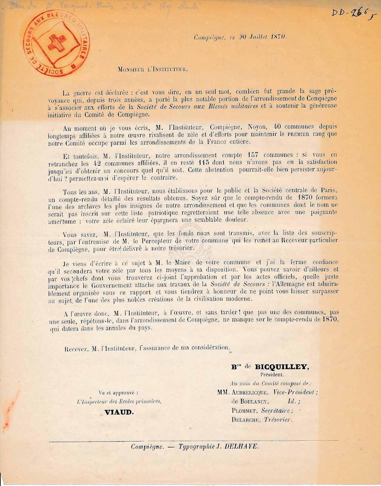 F- Lettre circulaire adressée aux instituteurs par le baron de Bicquilley, président de la Société de Secours aux Blessés militaires, afin d'inciter les instituteurs des communes de l'Oise à soutenir les actions de la Société dans leurs communes respectives - datée de Compiègne le 20 juillet 1870.