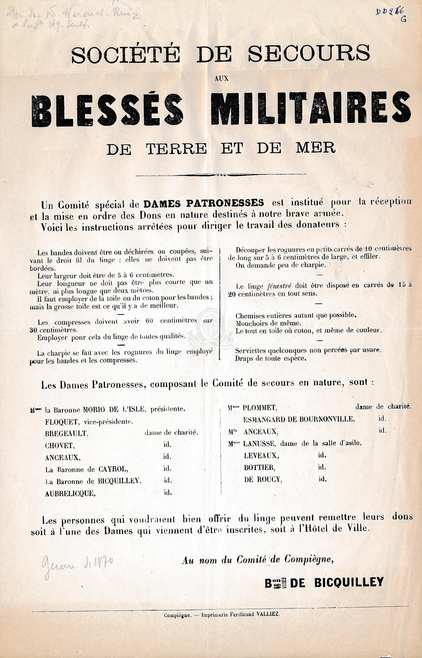 G- Placard de la Société de Secours aux Blessés militaires de Terre et de Mer demandant aux personnes qui voudront bien offrir du linge, à s'adresser au Comité spécial de dames patronesses chargé de gérer les dons - signé par le Baron de BicquilleyPermalink : ./index.php?lvl=notice_display&id=9312 Pièces en rapport avec la ville de Compiègne [Recueil factice de documents multisupports] . - 1849-1881 . - 7 pièces ; formats multiples.