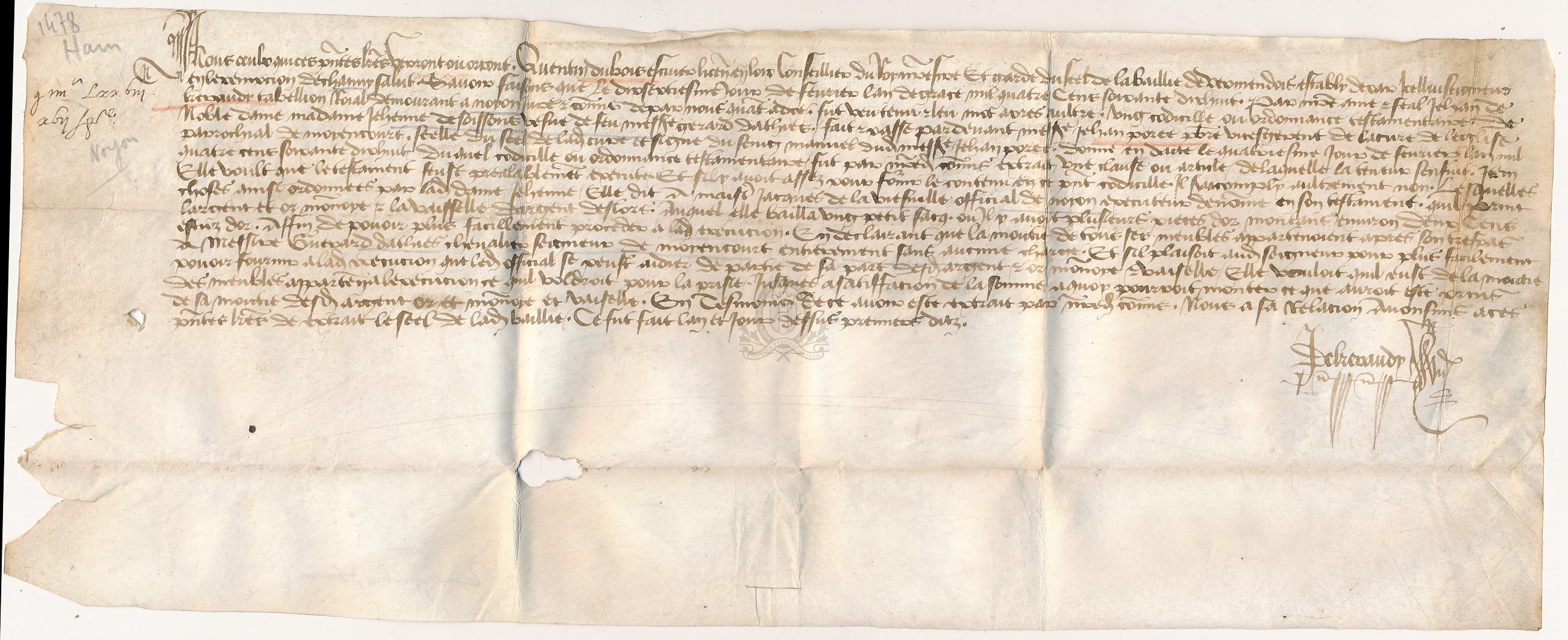 Titre : Codicille de noble dame Jeanne de Soissons, veuve de messire Gérard d'Athies, passé devant Mr Jean Poret, prêtre de la cure de l'église de Moyencourt Type de document : texte manuscrit ou tapuscrit Auteurs et Fonctions : Jeanne de Soissons (14..-14..), Auteur ; Gérard d'Athies (14..-aps 1439), Nom associé ; Jean Poret (14..-14..), Nom associé ; Jacques de la Viefuille (14..-14..), Nom associé Année de publication : 1478 (02-17) Importance : Parchemin manuscrit (1 f.) Format : 17 x 42 cm Langues : Français (fre) Sujets : [2 - Thésaurus Brunet-Parguez ] Droit et Jurisprudence:Droit civil et criminel:Droit français : première partie jusqu' à l'Assemblée Nationale Constituante (1789-1791):Notariat et Ministère des huissiers