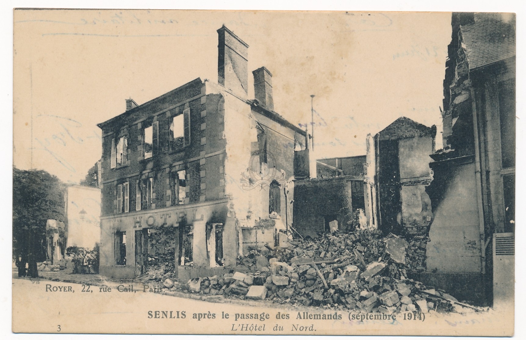 [3 - Thèmes locaux] Noms géographiques:Arrondissement et canton de Senlis (commune, canton et arrondissement):Senlis (Oise):Rues:rue de la RépubliqueIndex. décimale : 940.405 Atrocités, destructions et mesures de répression durant la Guerre mondiale de 1914-1918 Forme de la ressource : Reproduction photomécanique Fonction : Carte postale Permalink : ./index.php?lvl=notice_display&id=21164 Senlis après le passage des Allemands (septembre 1914), 3. L'Hôtel du Nord [document graphique à deux dimensions] . - Paris : Royer, [s.d. (1914)] . - 1 carte postale : ill. en noir et blanc ; 9 x 14 cm.