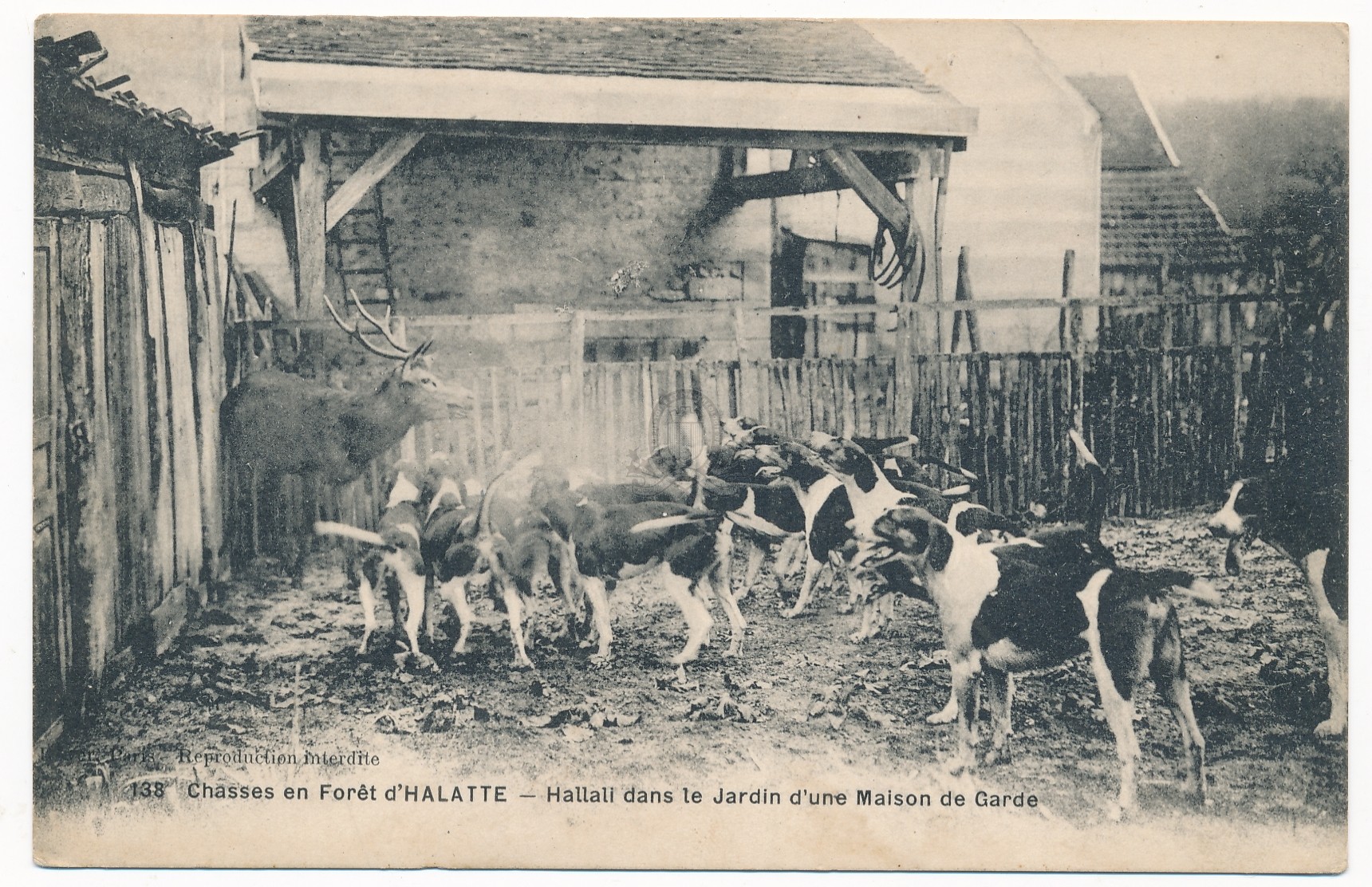 Titre de série : Chasses en forêt d'Halatte, 138 Titre : Hallali dans le jardin d'une maison de garde Type de document : document graphique à deux dimensions Editeur : Paris : Royer Année de publication : [s.d. (avt 1914)] Importance : 1 carte postale Illustrations : ill. en noir et blanc Format : 9 x 14 cm Langues : Français (fre) Sujets : [3 - Thèmes locaux] Noms communs ou Sujets:F... (Faillites à Fronde):Forêts:Forêt d'Halatte