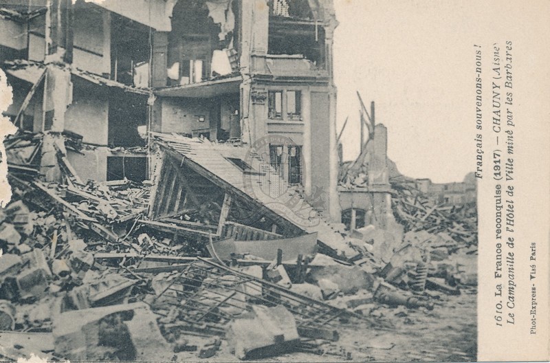 PermalinkLa France reconquise (1917), 1610. Chauny (Aisne - Le campanille (sic) de l'Hôtel de Ville miné par les barbares ([s.d. (1917)])