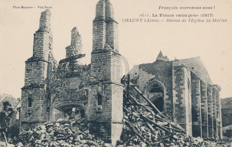 Péronne Lamentable aspect des maisons en ruinesURLLa France reconquise (1917), 1526. Lassigny (Oise) - Vestiges de l'église que les Allemands firent sauter à la mine ([s.d. (1917)])