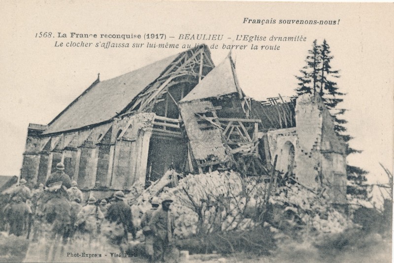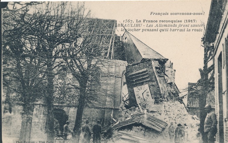 Noyon - Vestiges de l'occupation allemandeURLLa France reconquise (1917), 1567. Beaulieu - Les Allemands firent sauter le clocher pensant qu'il barrait la route ([s.d. (1917)])