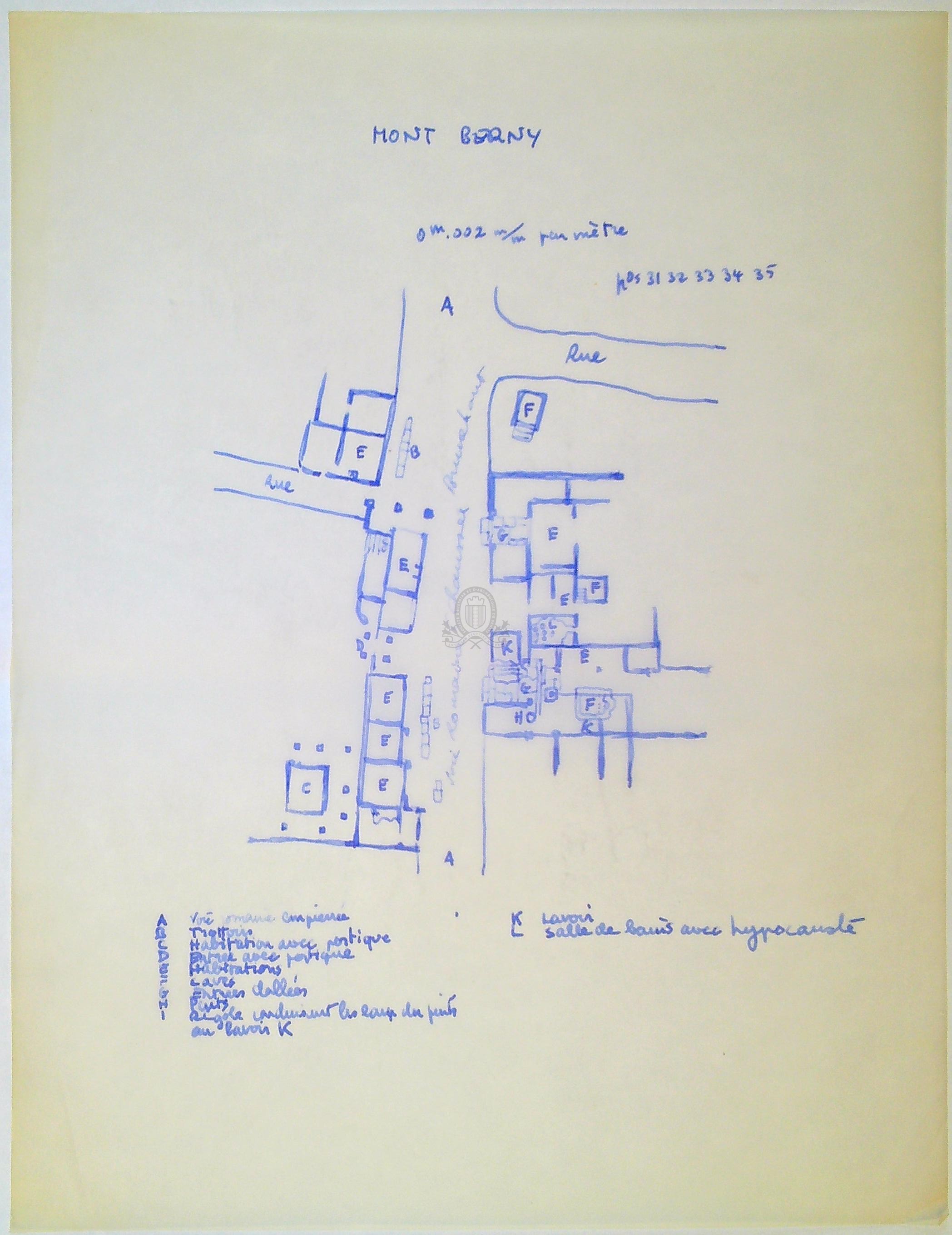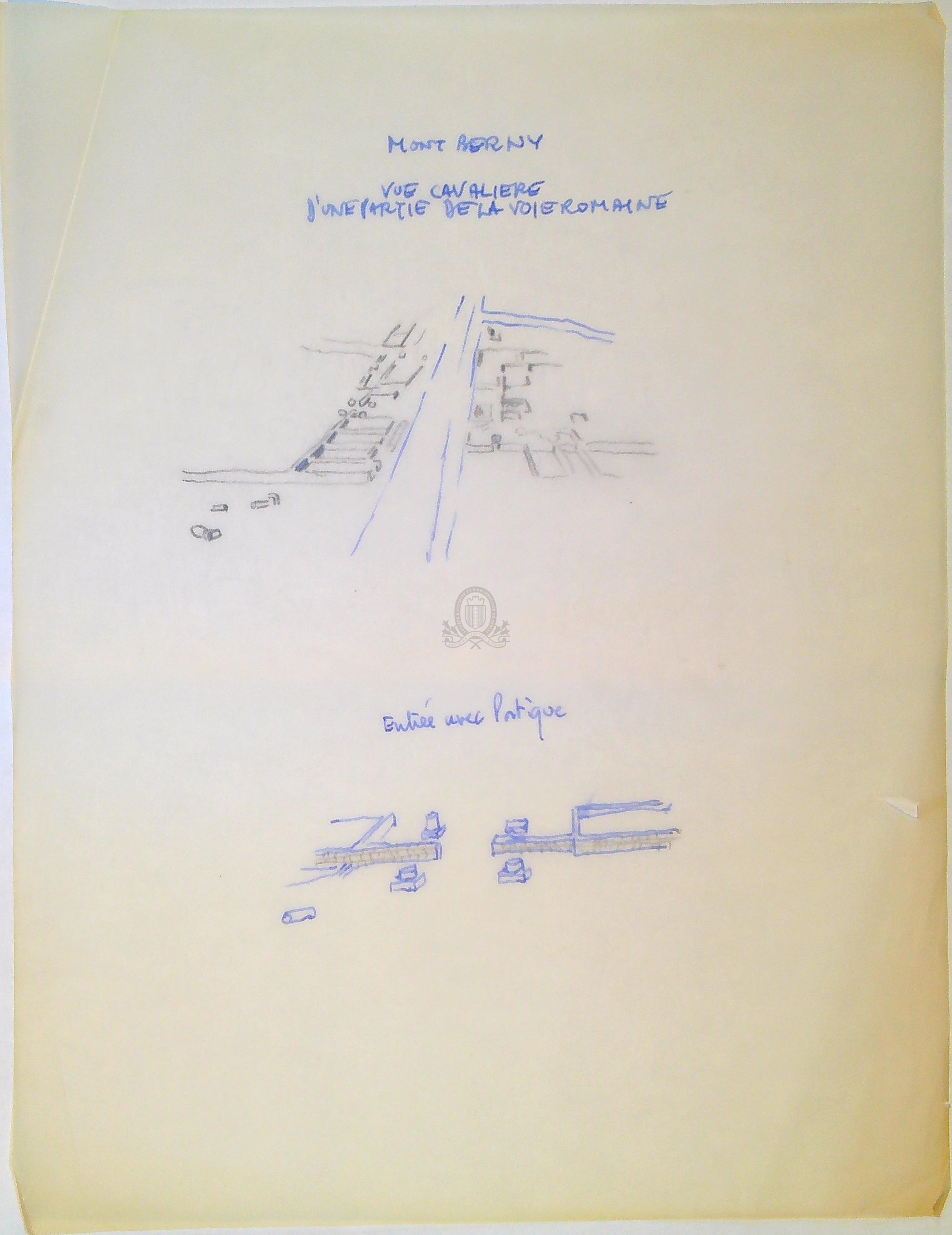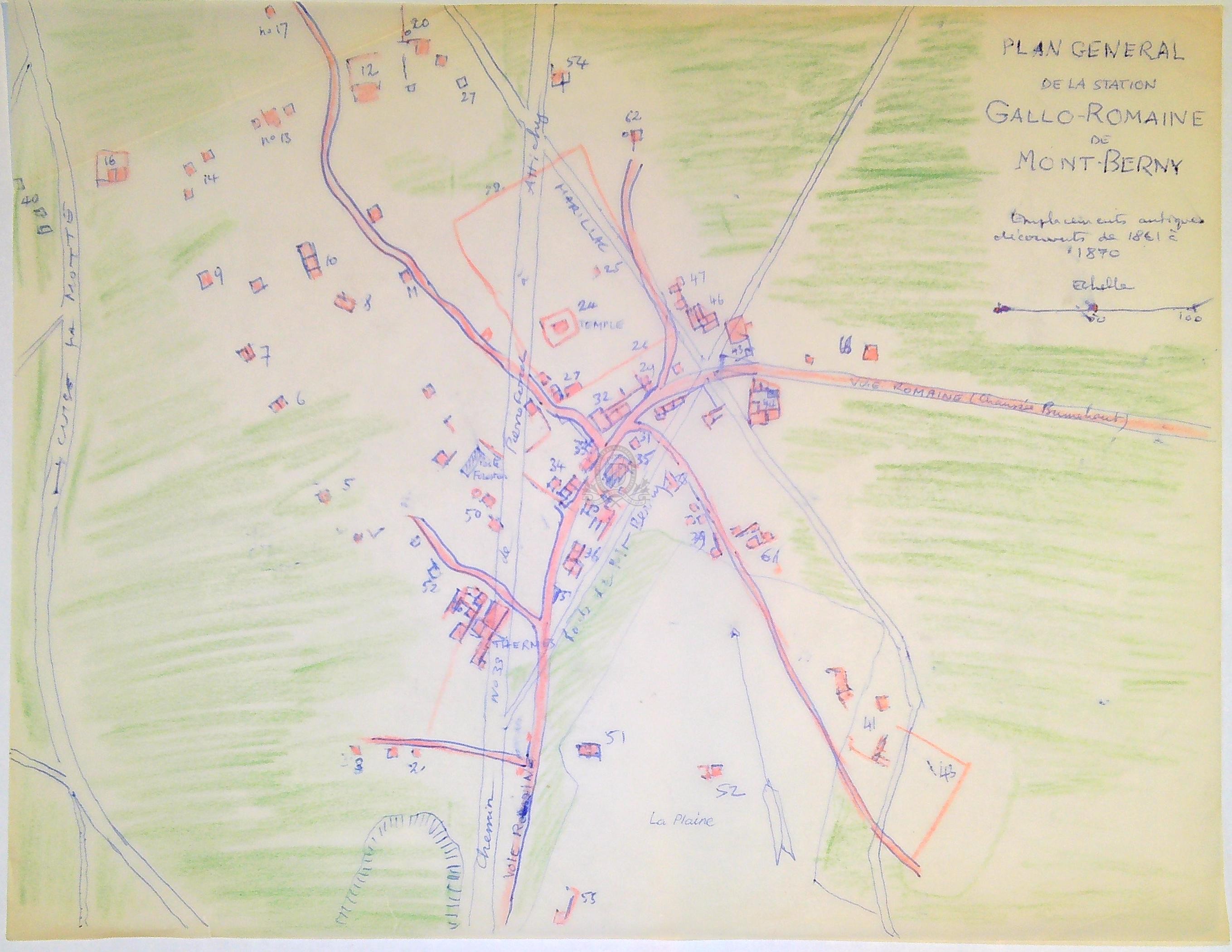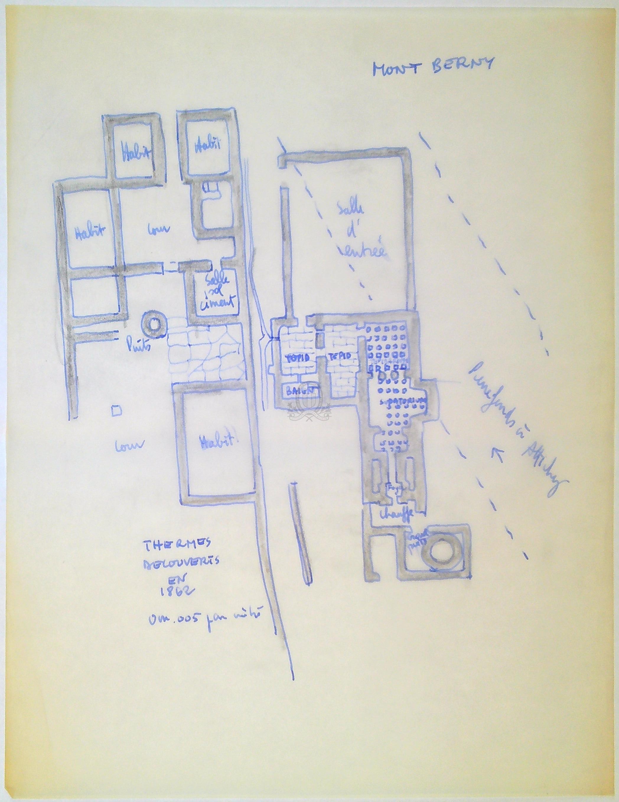 Ruines gallo-romaines du Mont-Berny dans la forêt de Compiègne [document graphique à deux dimensions] . - [s.d. (ca 1960 ?)] . - Papier calque (4 ff.) : encre bleue, crayons de couleur ; 31 x 24 cm. Langues : Français (fre)