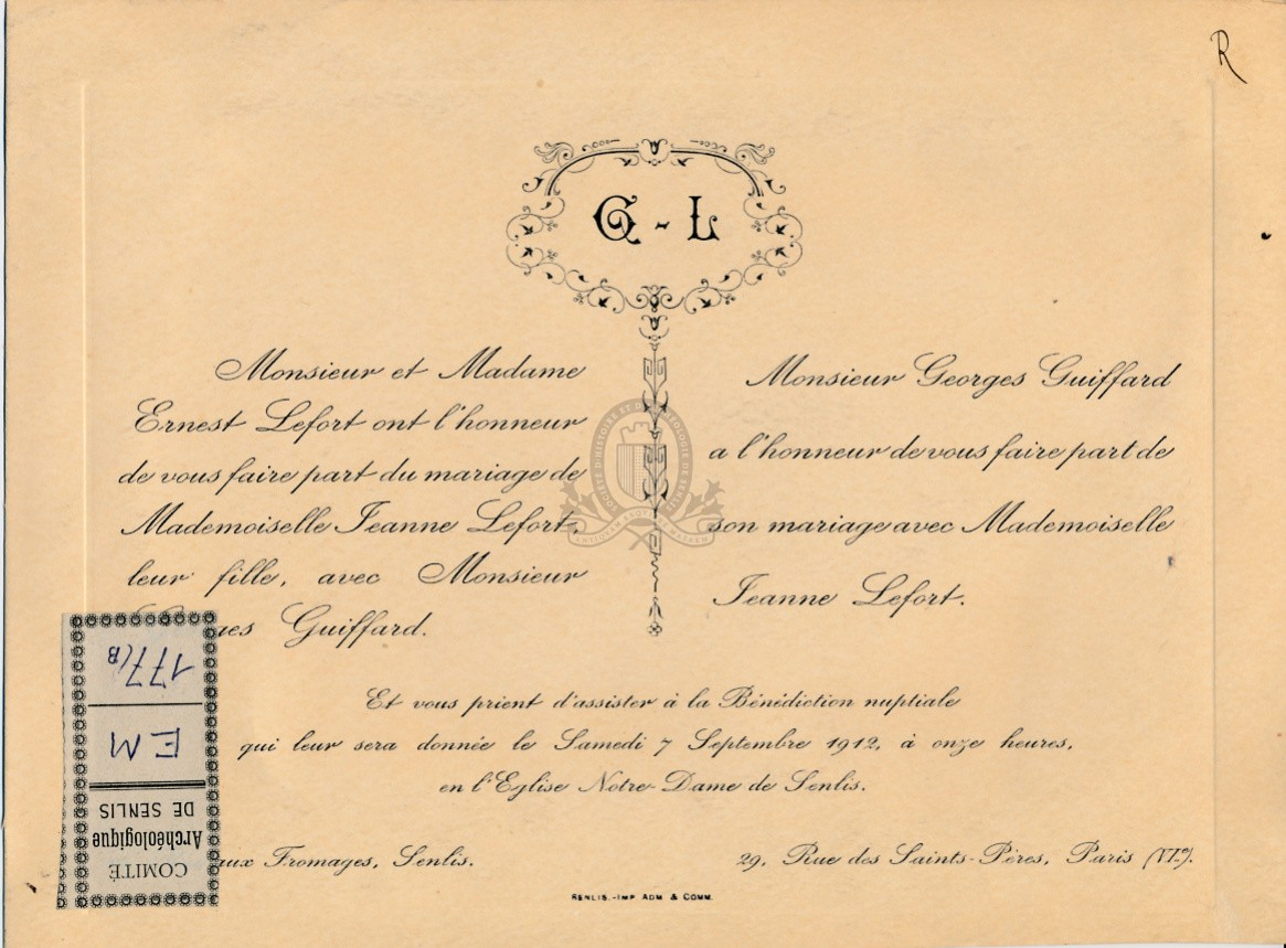 Le carton sur lequel est collé l'un des dessins est un faire-part de mariage de Jeanne Lefort et Jacques Guiffard, célébré le 7 septembre 1912, en l'église Notre-Dame de Senlis (Senlis, Impr. Adm. et Comm.)