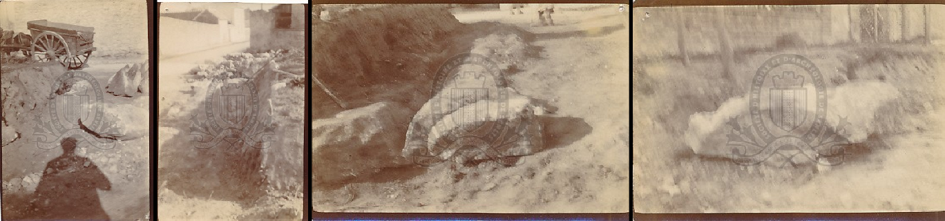 Dossier ayant pour objet la découverte effectuée à Chamant de dalles et pierres constituant le sol d'une voie romaine portant des traces profondes des roues des chars [texte manuscrit ou tapuscrit] / Fernand Bléry (18..-19..), Illustrateur ; Roeltgen (18..-19..), Photographe ; Félix Louat (1876-1944), Secrétaire, Rapporteur, Rédacteur . - [s.d. (> 1918)] . - 1 croquis (plume, encre de chine) + 4 épreuves photographiques (6x4), dans une chemise en papier : ill., phot. ; Formats multiples. Les pièces ont été mises à jour lors de l'érection du monument aux morts de la guerre 1914-1918 et présentées à la Société par m. Louat Langues : Français (fre)