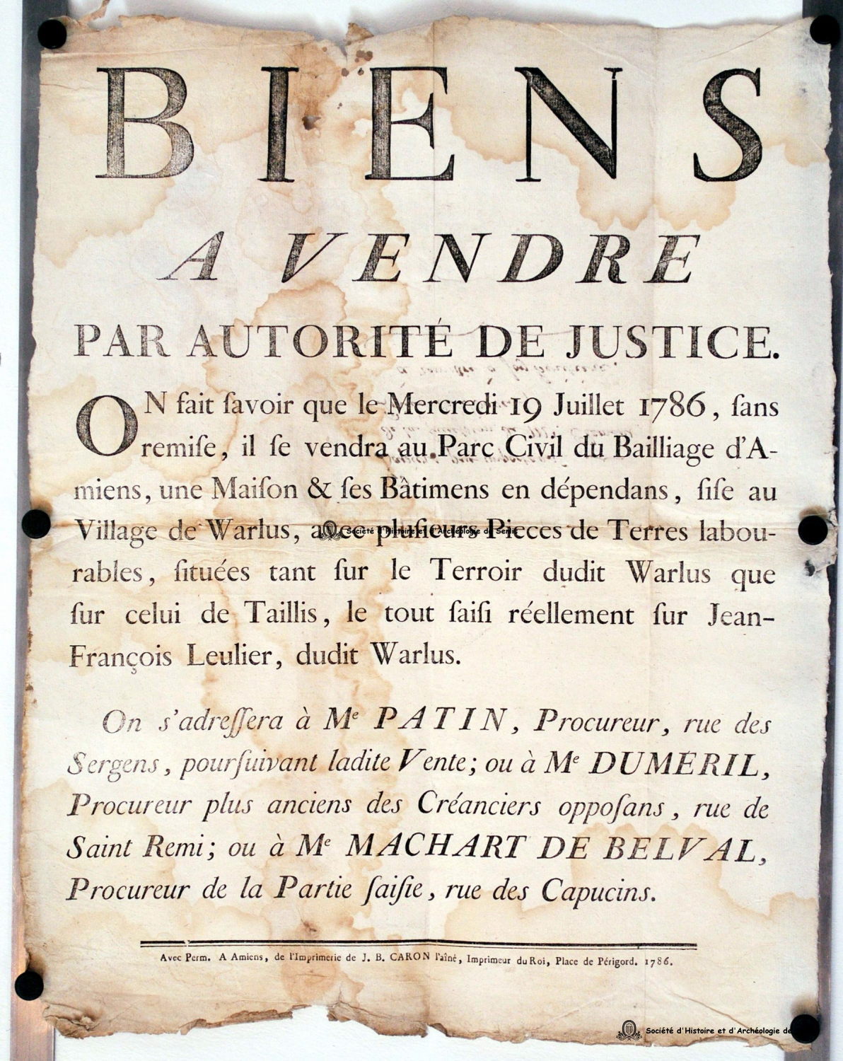PermalinkBiens à vendre par autorité de justice. On fait savoir que le mercredi 19 juillet 1786, [...] il se vendra au Parc civil du Bailliage d'Amiens, une maison & ses bâtimens en dépendans, sis au village de Warlus, avec plusieurs pièces de terres labourables, situées tant sur le terroir dudit Warlus que sur celui de Taillis, le tout saisi réellement sur Jean-François Leulier, dudit Warlus [...] (1786)