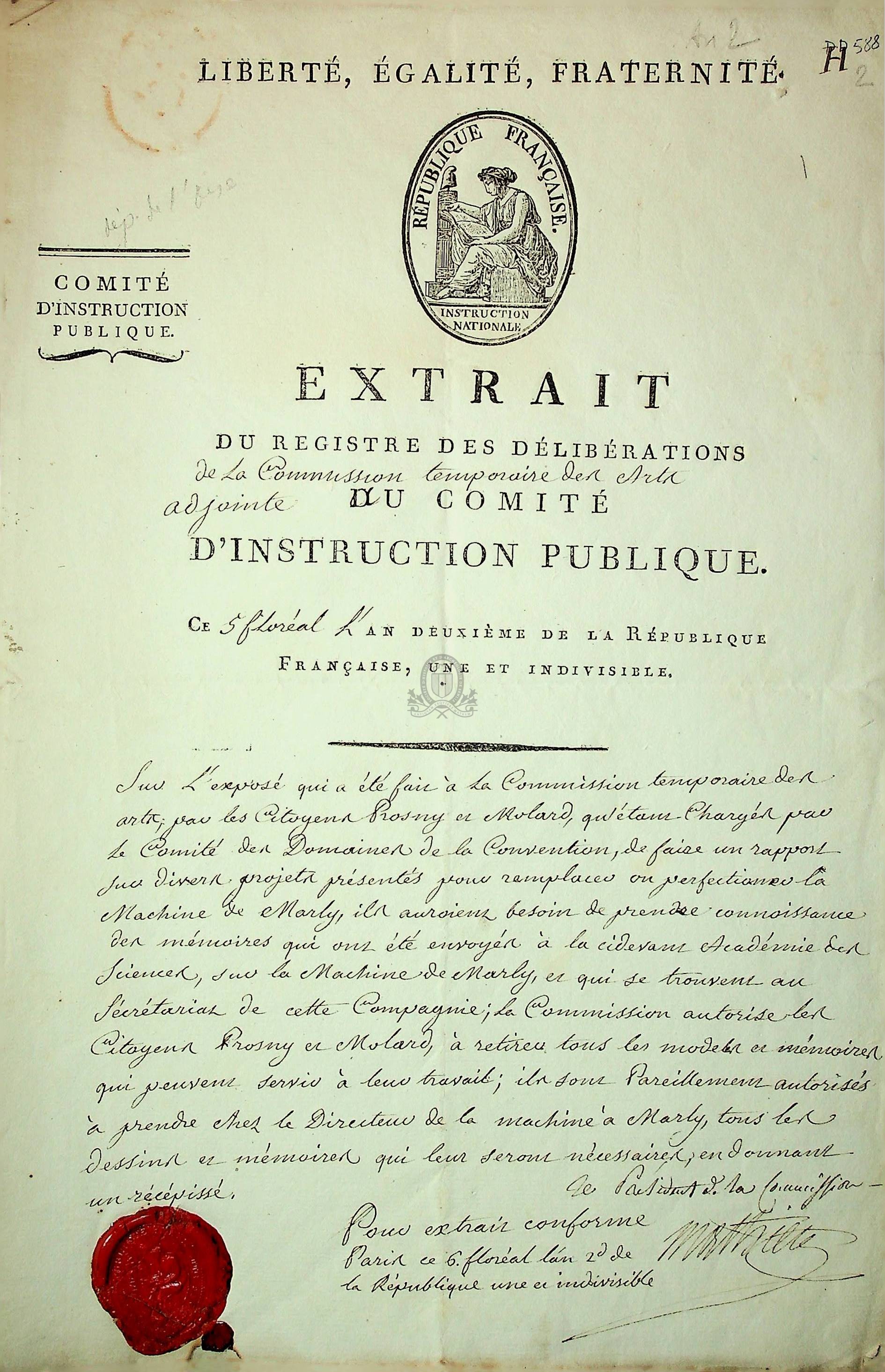 Pièce n°2 : Extrait du registre des délibérations de la Commission temporaire des Arts adjointe du Comité d'Instruction Publique au sujet de la Machine de Marly et des travaux engagés par les citoyens Prosny et Molard, Paris le 25 avril 1794, 2 ff., 31 cm. Cachet de cire rouge de la République Française Instruction Nationale.