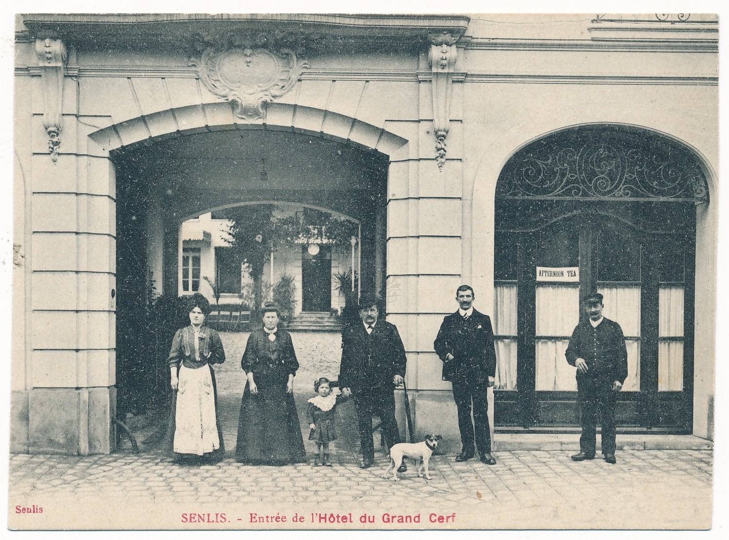 Titre : Entrée de l'Hôtel du Grand Cerf Type de document : document graphique à deux dimensions Editeur : Senlis : [s.n.] Année de publication : [s.d. (avt 1914)] Importance : 1 carte postale Illustrations : ill. en noir et blanc Format : 9 x 12 cm Langues : Français (fre) Sujets : [3 - Thèmes locaux] Noms communs ou Sujets:H... à J... (Habitat à Journalisme):Hôtels