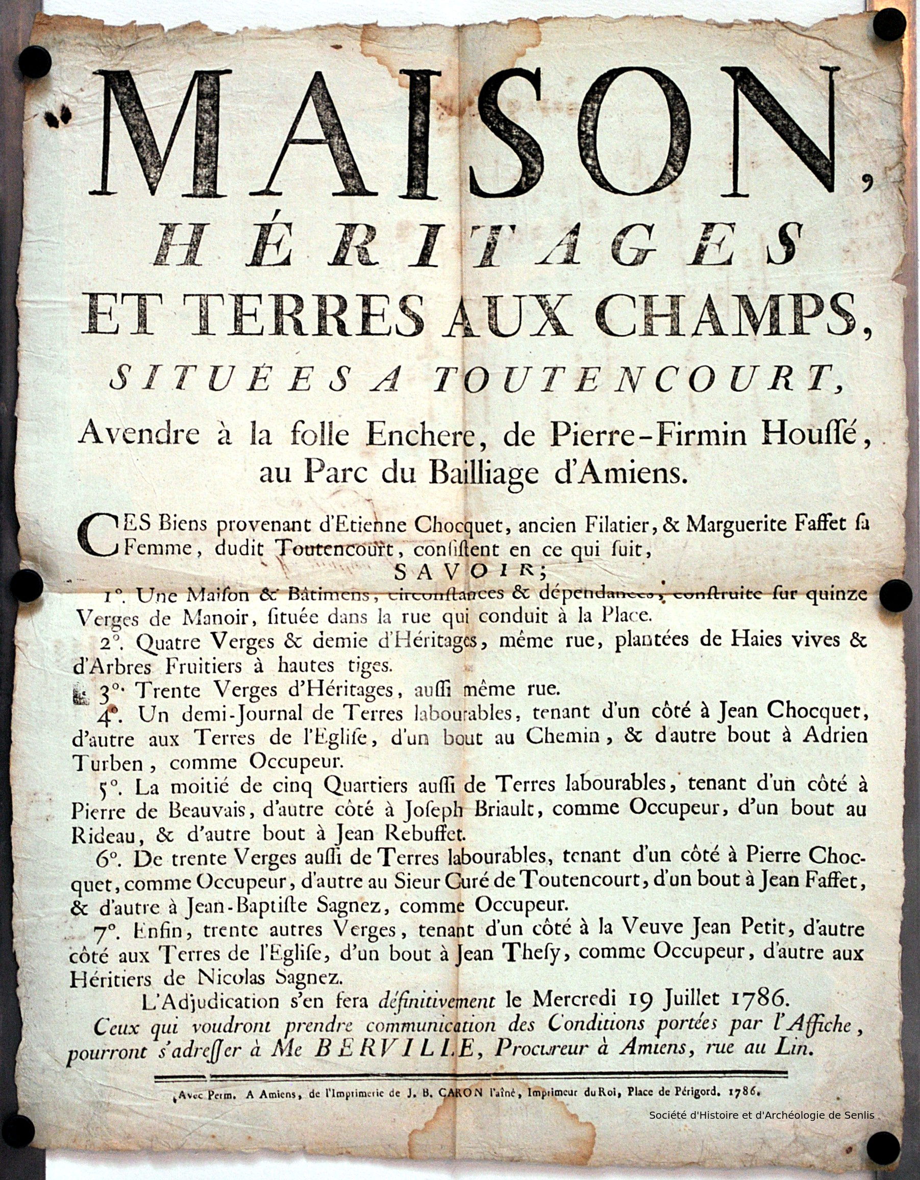 PermalinkMaison, héritages et terres aux champs, situées à Toutencourt, à vendre à la folle enchère, de Pierre-Firmin Houssé, au Parc du Bailliage d'Amiens [...] (1786)
