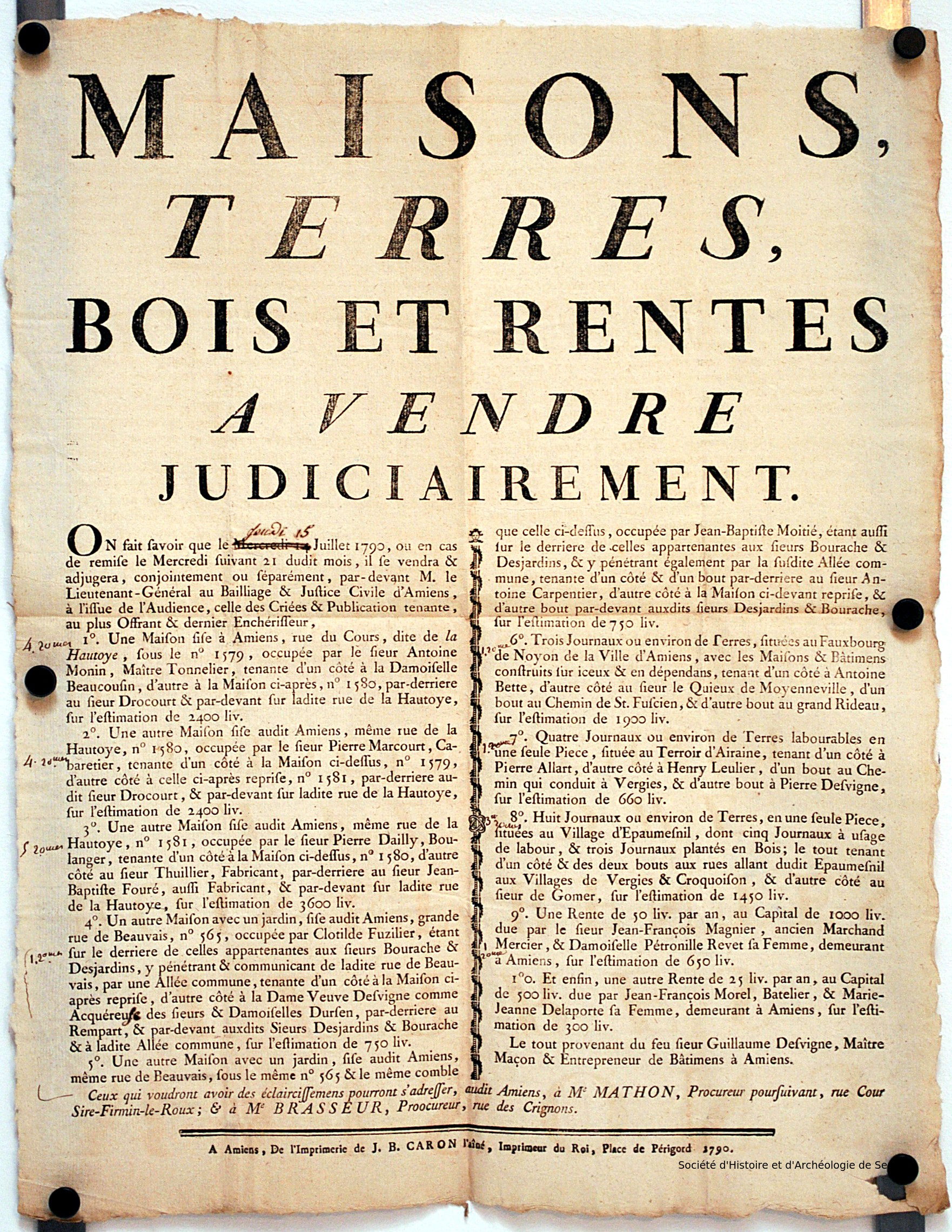 [1 - Thésaurus UNESCO ] Pays et ensembles de pays:Europe:France:Picardie (Aisne - Oise - Somme):Somme (département)Index. décimale : 381.17 Ventes aux enchères (ventes aux enchères de biens d'occasion, ventes publiques) Période chronologique : 1700-1799 Permalink : ./index.php?lvl=notice_display&id=7437 Biens à vendre par autorité de justice. On fait savoir que le mercredi 19 juillet 1786, [...] il se vendra au Parc civil du Bailliage d'Amiens, une maison & ses bâtimens en dépendans, sis au village de Warlus, avec plusieurs pièces de terres labourables, situées tant sur le terroir dudit Warlus que sur celui de Taillis, le tout saisi réellement sur Jean-François Leulier, dudit Warlus [...] [texte imprimé] / procureur Patin (18e siècle), Nom associé ; procureur Duméril (18e siècle), Nom associé ; procureur Machart de Belval (18e siècle), Nom associé ; Jean-Baptiste Caron (1747-1819), Imprimeur . - A Amiens : de l'imprimerie de J.-B. Caron l'aîné, 1786 . - 1 f. ; 45x36 cm.