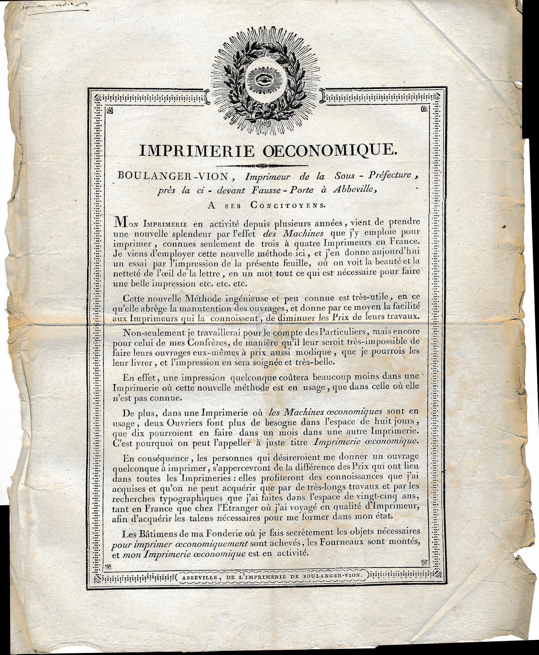 Exclu du prêtImprimerie oeconomique. Boulanger-Vion, imprimeur de la Sous-Préfecture, [...] à ses concitoyens ([s.d. (ca 1806)])