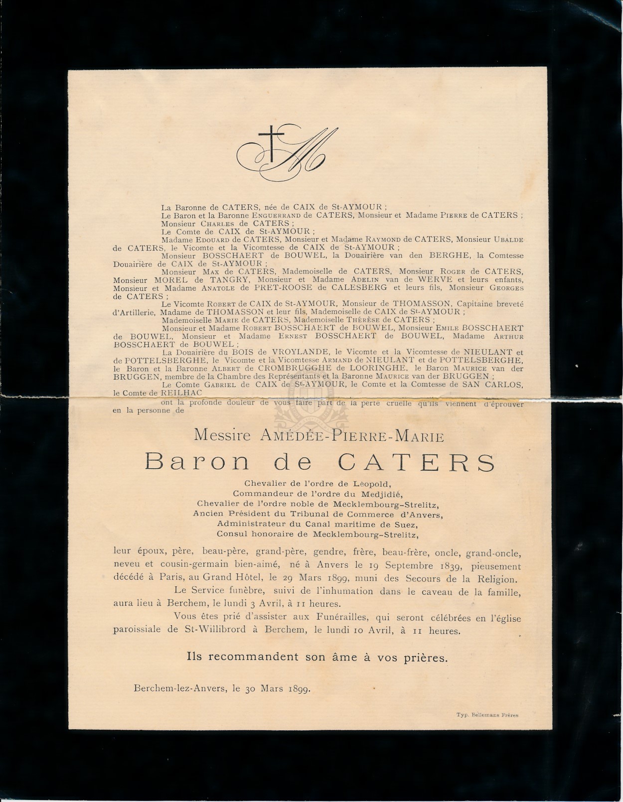B4- Faire-part de décès du baron Amédée-Pierre-Marie de Caters dont la femme est née de Caix de Saint-Aymour, survenu à Paris le 29 mars 1899.