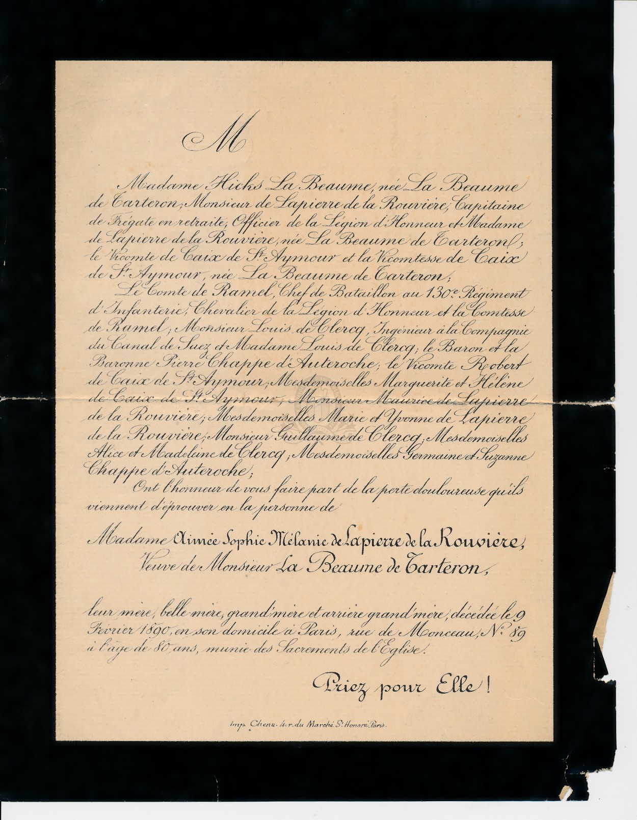 B5- Faire-part de décès de Mme Aimée Sophie Mélanie de Lapierre de la Rouvière, veuve de Monsieur La Beaume de Tarteron, décédée à Paris le 9 février 1890 (2 exemplaires)