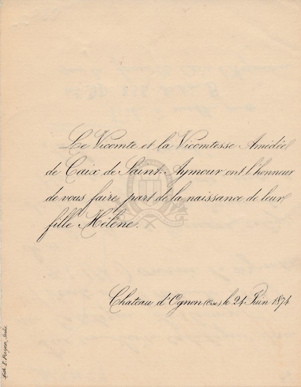 B6- Faire-part de naissance de Hélène, fille d'Amédée et de Berthe de Caix de Saint-Aymour, datée du 24 juin 1874 du château d'Ognon et impr. par E. Payen à SenlisType de ressource : Faire-part Période chronologique : 1800-1899 Permalink : ./index.php?lvl=notice_display&id=9722 Exemplaires (1)