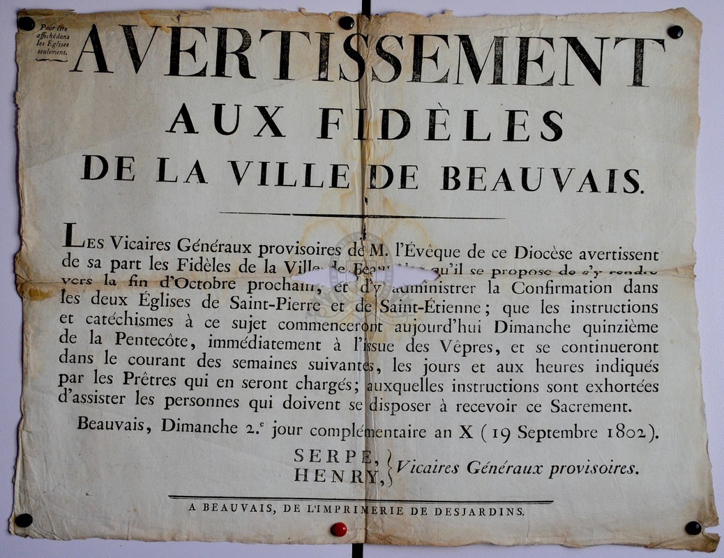 Signé : Serpe, Henry, vicaires généraux provisoiresLangues : Français (fre) Permalink : ./index.php?lvl=notice_display&id=3750 Avertissement aux fidèles de la ville de Beauvais. Les vicaires généraux provisoires de M. l'évêque de ce diocèse avertissent de sa part les fidèles de la ville de Beauvais qu'il se propose de s'y rendre vers la fin d'octobre prochain, et d'administrer la confirmation dans les deux églises de Saint-Pierre et de Saint-Etienne ; [...] [texte imprimé] / vicaire Serpe, Signataire ; (vicaire) Henry, Signataire . - A Beauvais : De l'imprimerie de Desjardins, 1802 . - 1 f. ; 41 x 52 cm.