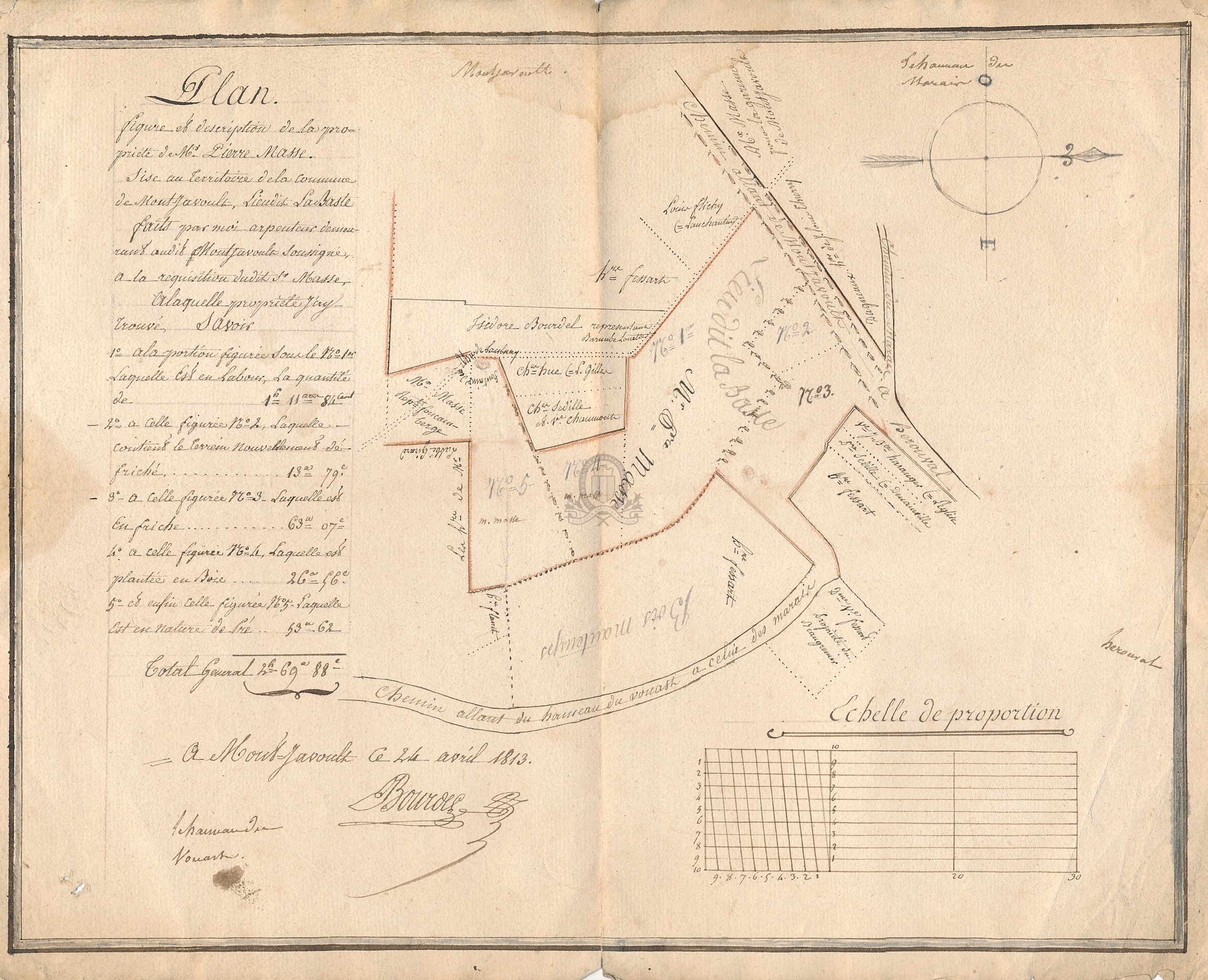 [3 - Thèmes locaux] Noms géographiques:Arrondissement de Beauvais (commune, canton et arrondissement):Montjavoult (Oise)Note de contenu : Pièce A1 : Plan, figure et description de la propriété de Mr Pierre Masse sise au territoire de la commune de Montjavoult, lieudit la Baste [...] 24 avril 1813, 32x41 cm.