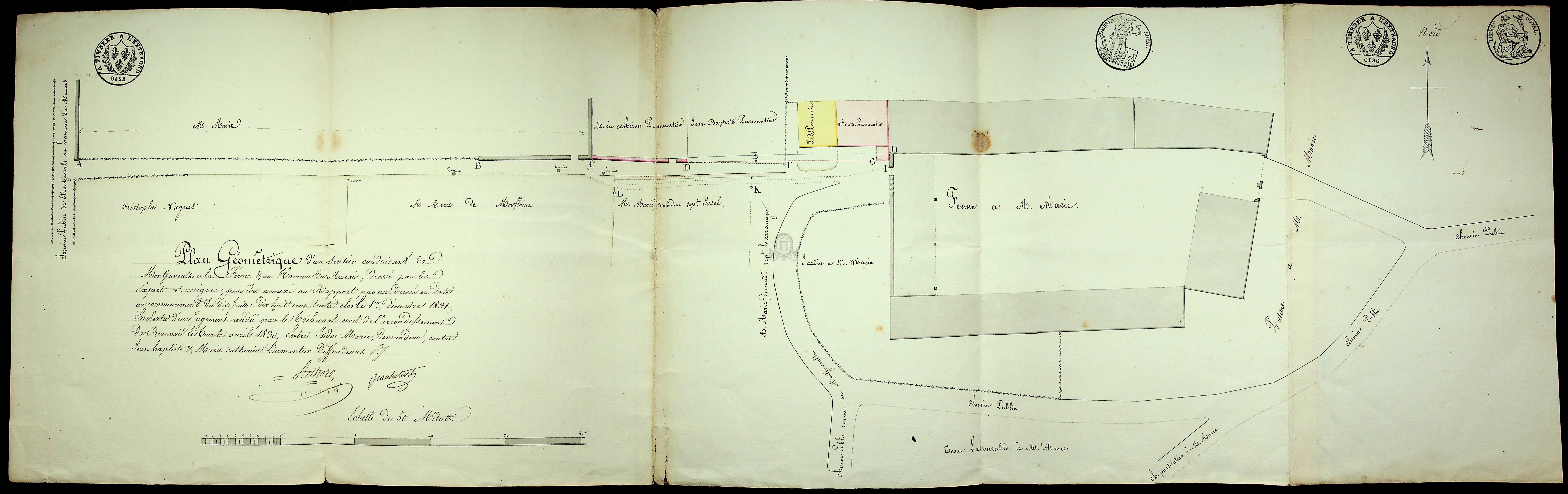 Pièce A2 : Plan géométrique d'un sentier conduisant de Montjavoult à la ferme et au hameau du Marais [...], 1830-1831, 25x82 cm.