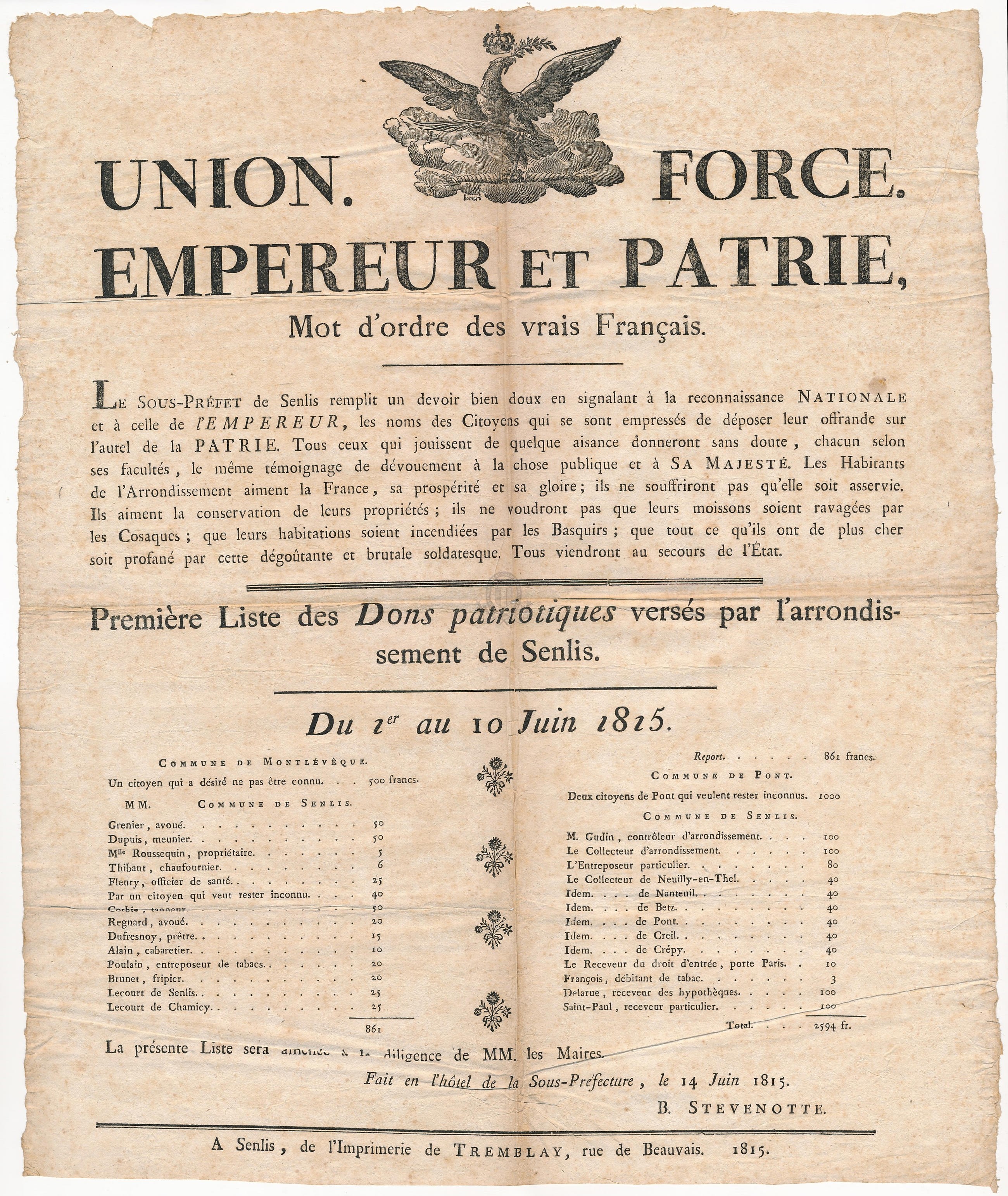 PermalinkUnion. Force. Empereur et patrie, mot d'ordre des vrais Français. Première liste des dons patriotiques versés par l’arrondissement de Senlis, du 1er au 10 juin 1815 / Sous-Préfecture (Senlis) (1815)