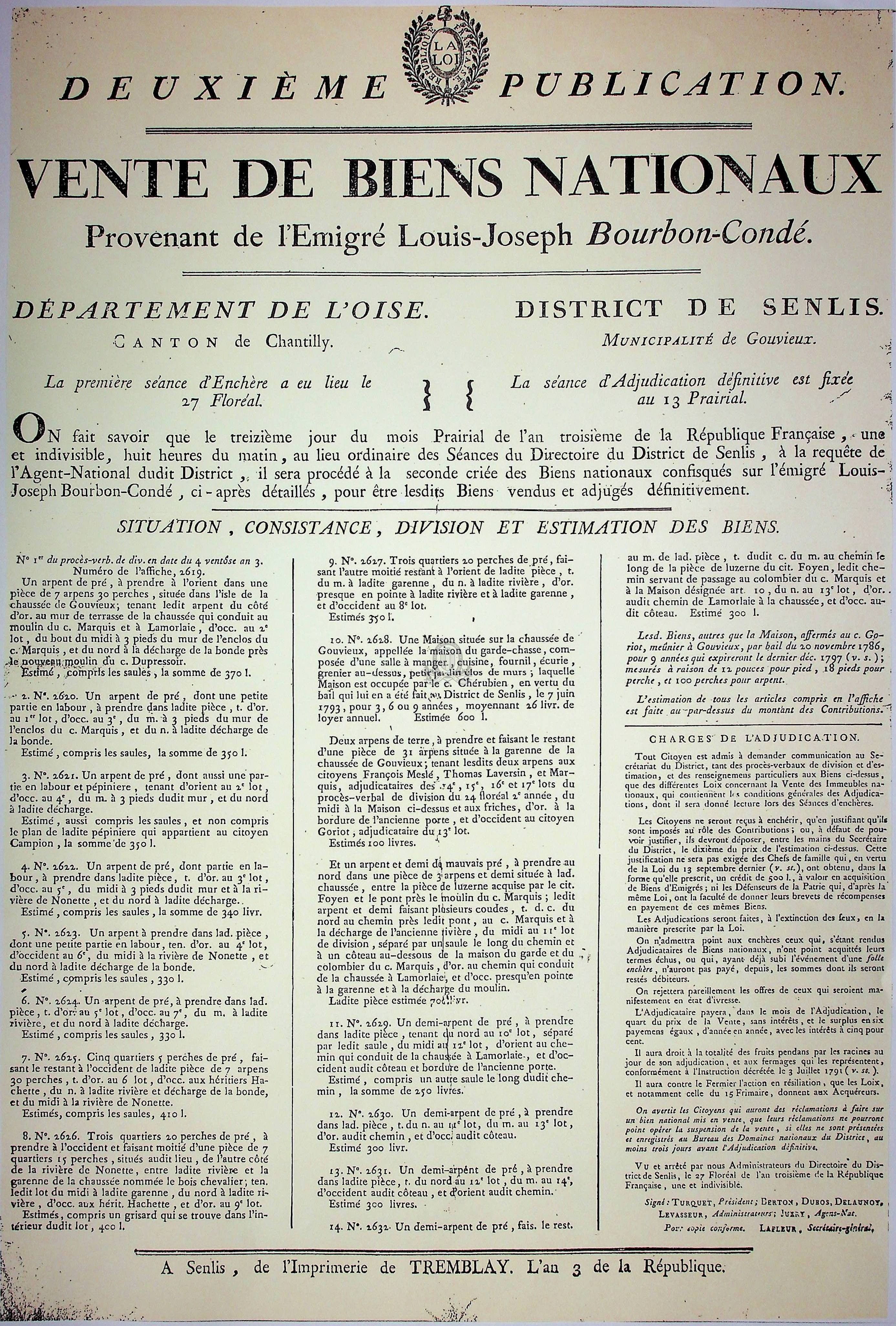 PermalinkVente de biens nationaux provenant de l'émigré Louis-Joseph Bourbon-Condé / Directoire, Département (1790-1800; Oise) (1795 (06-01))