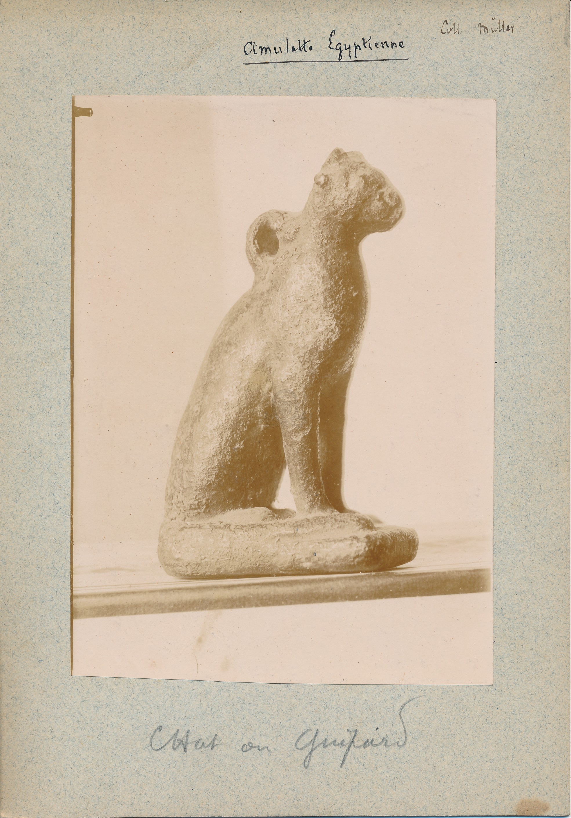 Titre de série : Collection Müller Titre : Amulette égyptienne Type de document : document graphique à deux dimensions Auteurs et Fonctions : Eugène Müller (1834-1918), Photographe Année de publication : [s.d. (avt 1914)] Importance : 1 épreuve photographique sur papier contrecollée sur carton Illustrations : ill. en noir et blanc Format : 17 x 12 cm (24 x 17 cm) Note générale : Chat ou guépard ? Langues : Français (fre) Index. décimale : 677.653 Dentelles (dentelle à l'aiguille, à la machine, aux fuseaux) Forme de la ressource : Epreuve photographique Permalink : ./index.php?lvl=notice_display&id=20446 Collection Müller. Amulette égyptienne [document graphique à deux dimensions] / Eugène Müller (1834-1918), Photographe . - [s.d. (avt 1914)] . - 1 épreuve photographique sur papier contrecollée sur carton : ill. en noir et blanc ; 17 x 12 cm (24 x 17 cm).