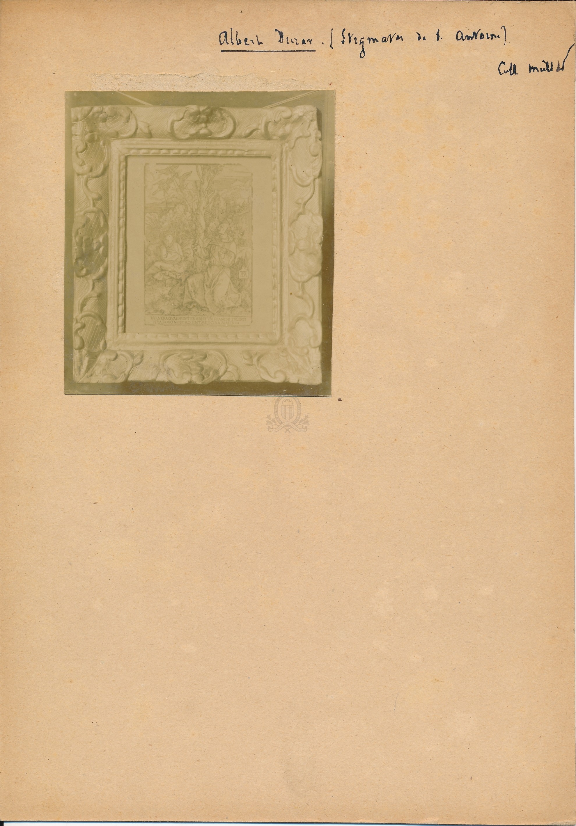 Titre de série : Collection Müller Titre : Albert Dürer - Stigmates de St Antoine Type de document : document graphique à deux dimensions Auteurs et Fonctions : Eugène Müller (1834-1918), Photographe Année de publication : [s.d. (avt 1914)] Importance : 1 épreuve photographique sur papier contrecollée sur carton Illustrations : ill. en noir et blanc Format : 9 x 8 cm (24 x 17 cm) Langues : Français (fre) Forme de la ressource : Epreuve photographique Permalink : ./index.php?lvl=notice_display&id=20452 Collection Müller. Albert Dürer - Stigmates de St Antoine [document graphique à deux dimensions] / Eugène Müller (1834-1918), Photographe . - [s.d. (avt 1914)] . - 1 épreuve photographique sur papier contrecollée sur carton : ill. en noir et blanc ; 9 x 8 cm (24 x 17 cm).