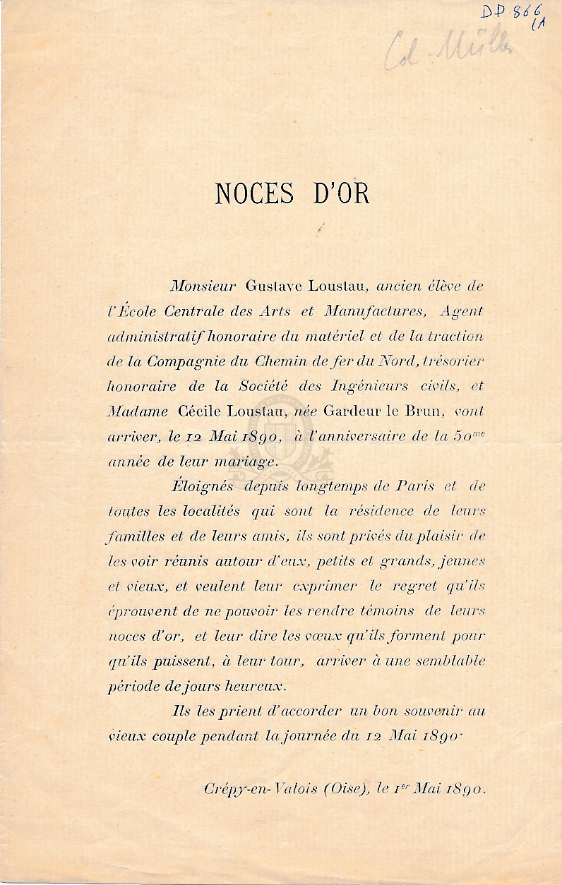1- Billet imprimé à l'occasion des noces d'Or de M. G. Loustau et de Mme Cécile Loustau, née Gardeur Le Brun, daté du 1er mai 1890