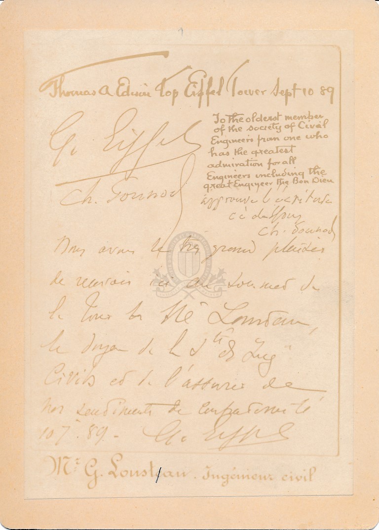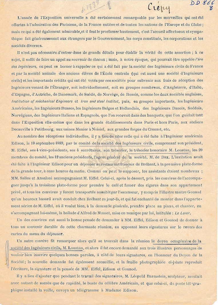 2 - Texte imprimé à l'occasion de l'Exposition universelle de 1889 (Paris) au cours de laquelle fut organisée par la Société des ingénieurs civils, une réception pour la venue de l'ingénieur américain Th. Edison ; M. Loustau y fut honoré et trois illustres personnages de l'assemblée : G. Eiffel, président de l'association, Th. Edison et Ch. Gounod dédicacèrent les revers des cartes du menu du déjeuner.