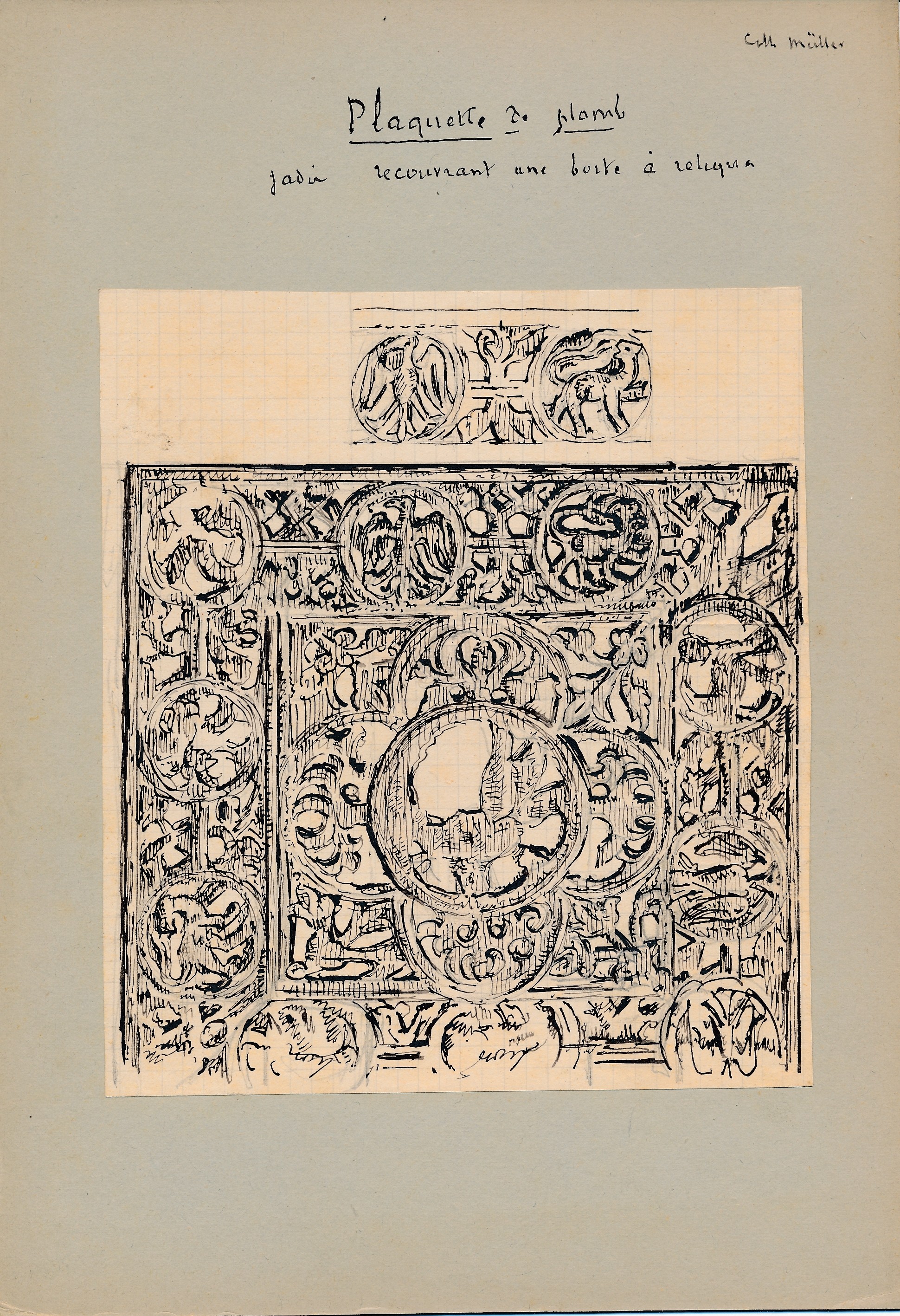 Collection Müller. Plaquette de plomb jadis recouvrant une boite à reliques [document graphique à deux dimensions] / Eugène Müller (1834-1918), Illustrateur . - [s.d. (avt 1914)] . - 1 dessin, encre noir sur papier quadrillé, contrecollé sur carton : ill. en noir et blanc ; 14.5 x 13 cm (24 x 16.5 cm). Langues : Français (fre)