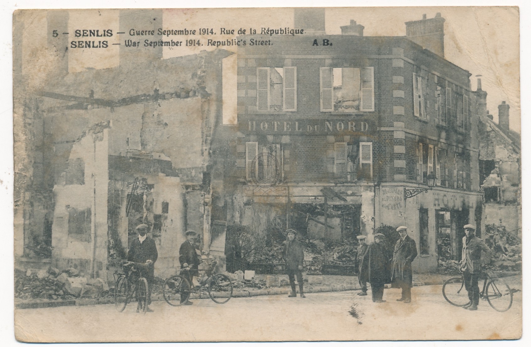 [3 - Thèmes locaux] Noms géographiques:Arrondissement et canton de Senlis (commune, canton et arrondissement):Senlis (Oise):Rues:rue de la RépubliqueIndex. décimale : 940.405 Atrocités, destructions et mesures de répression durant la Guerre mondiale de 1914-1918 Note de contenu : Hôtel du nord Forme de la ressource : Reproduction photomécanique Fonction : Carte postale Permalink : ./index.php?lvl=notice_display&id=21163 Senlis - Septembre 1914, 5. Rue de la République = Republic's street [document graphique à deux dimensions] . - Tours : Boucher, [s.d. (1914)] . - 1 carte postale : ill. en noir et blanc ; 9 x 14 cm.