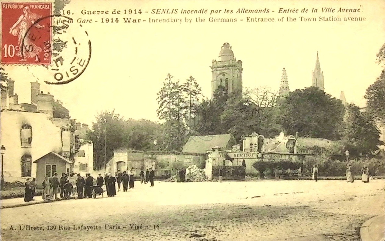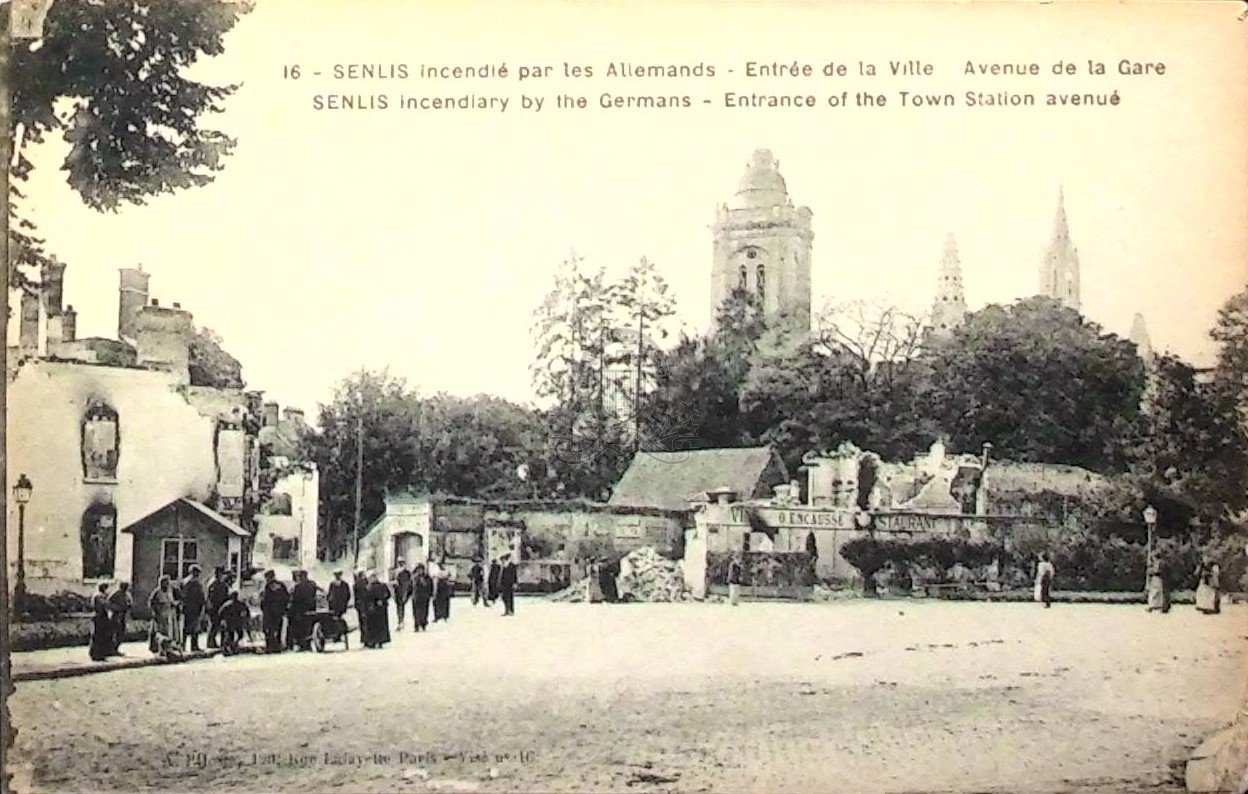 Senlis, 16. Senlis incendié par les Allemands - Entrée de la ville - Avenue de la gare = Senlis incendiary by the Germans - Entrance of the town station avenue [document graphique à deux dimensions] . - Paris : L'Hoste, [s.d. (ca 1914)] . - 1 carte postale : ill. en noir et blanc ; 9 x 14 cm. Langues : Français (fre) Anglais (eng)