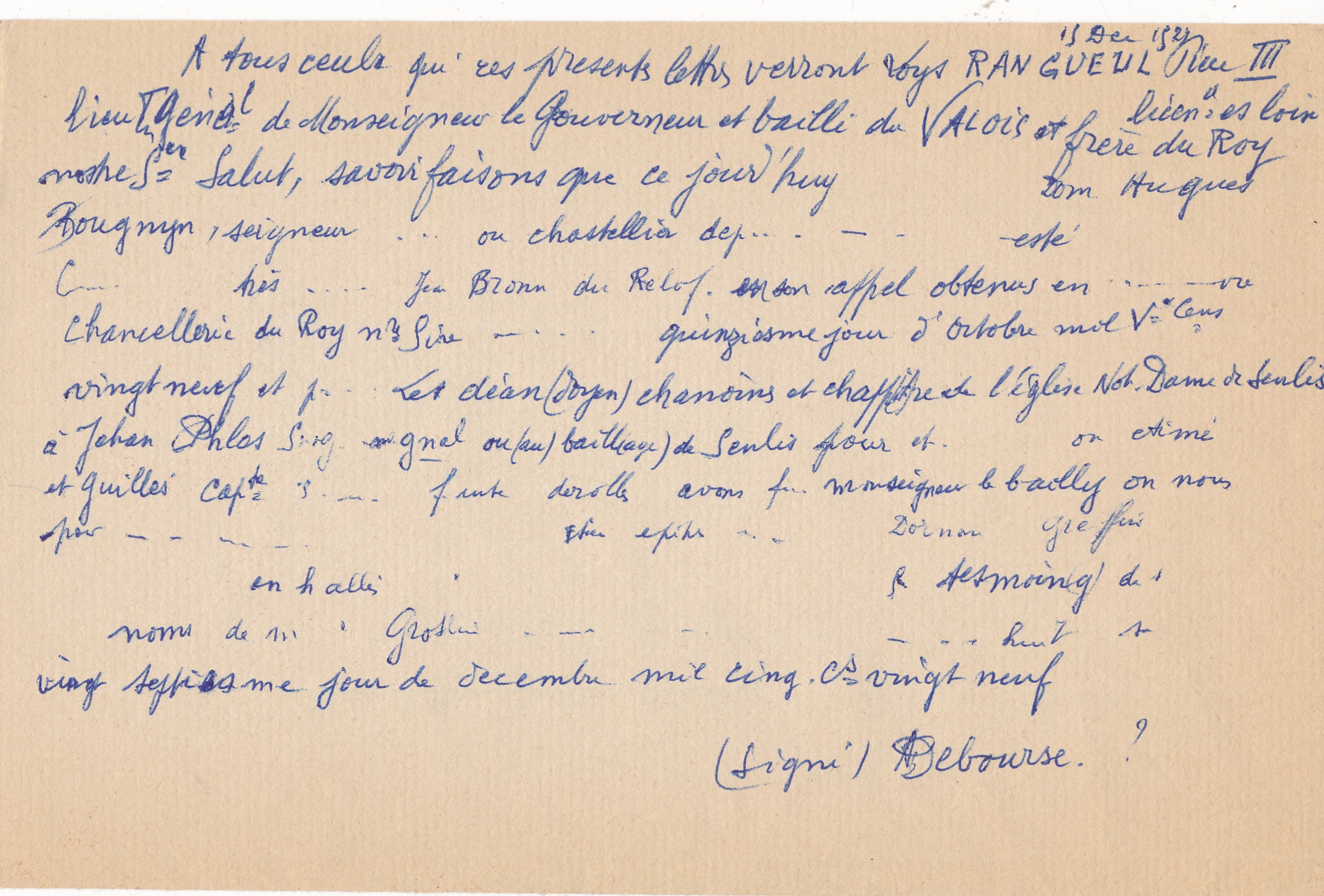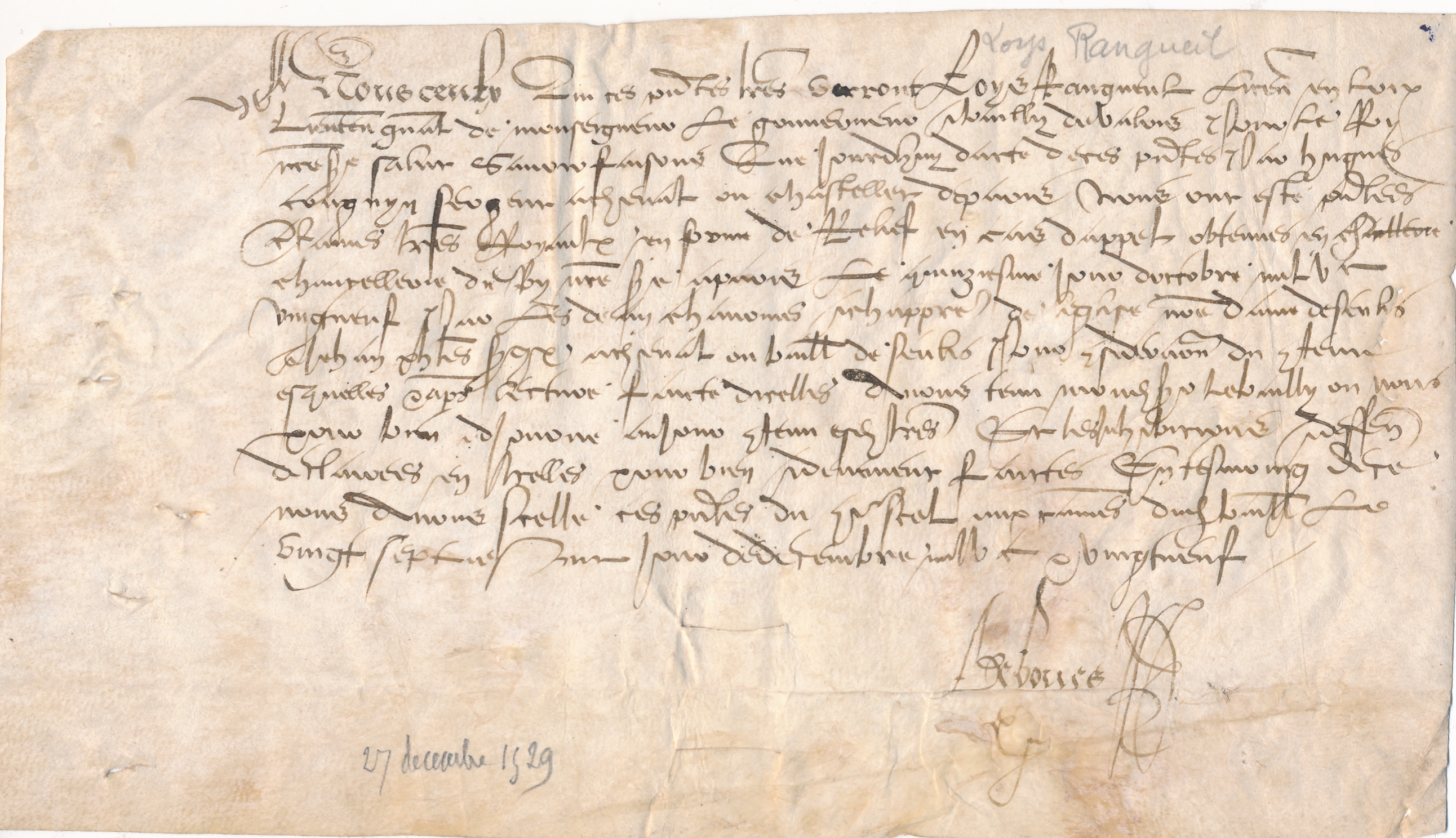 Lettre patente de Loys Rangueul, lieutenant général du gouverneur et bailli du Valois / Léon Dautheuil (1529 (12-27))