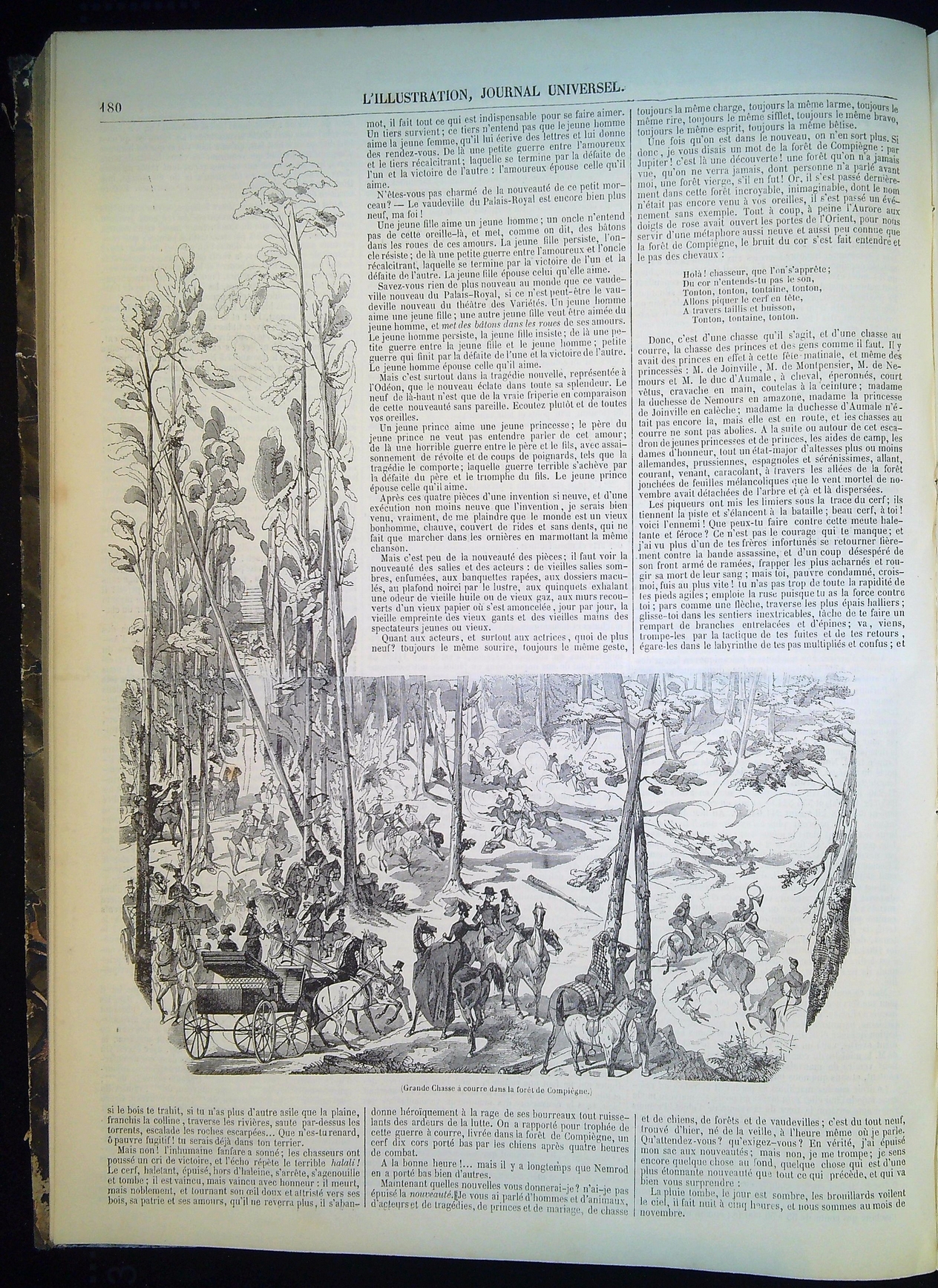 in L'Illustration > Tome IV (Septembre 1844 - Février 1845) . - p. 180[article] Grande chasse courre dans la forêt de Compiègne [document graphique à deux dimensions] . - 1845 . - p. 180.
