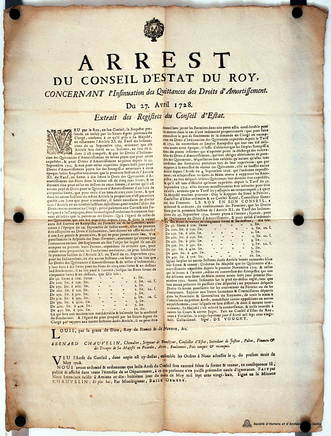 Arrest du Conseil d'Estat du Roy, concernant l'insinuation des quittances des droits d'amortissementURLArrest du Conseil d'Estat du Roy, Qui casse une sentence du sieur lieutenant général du bailliage de Clermont en Beauvoisis : Fait défense audit sieur lieutenant général & à tous juges de s'immisser [...] dans la connoissance des droits du controlle des actes & autres y joints [...] Du treize may 1721 / Conseil d'Etat du Roi (13..-1791; France) ([s.d. (1721)])