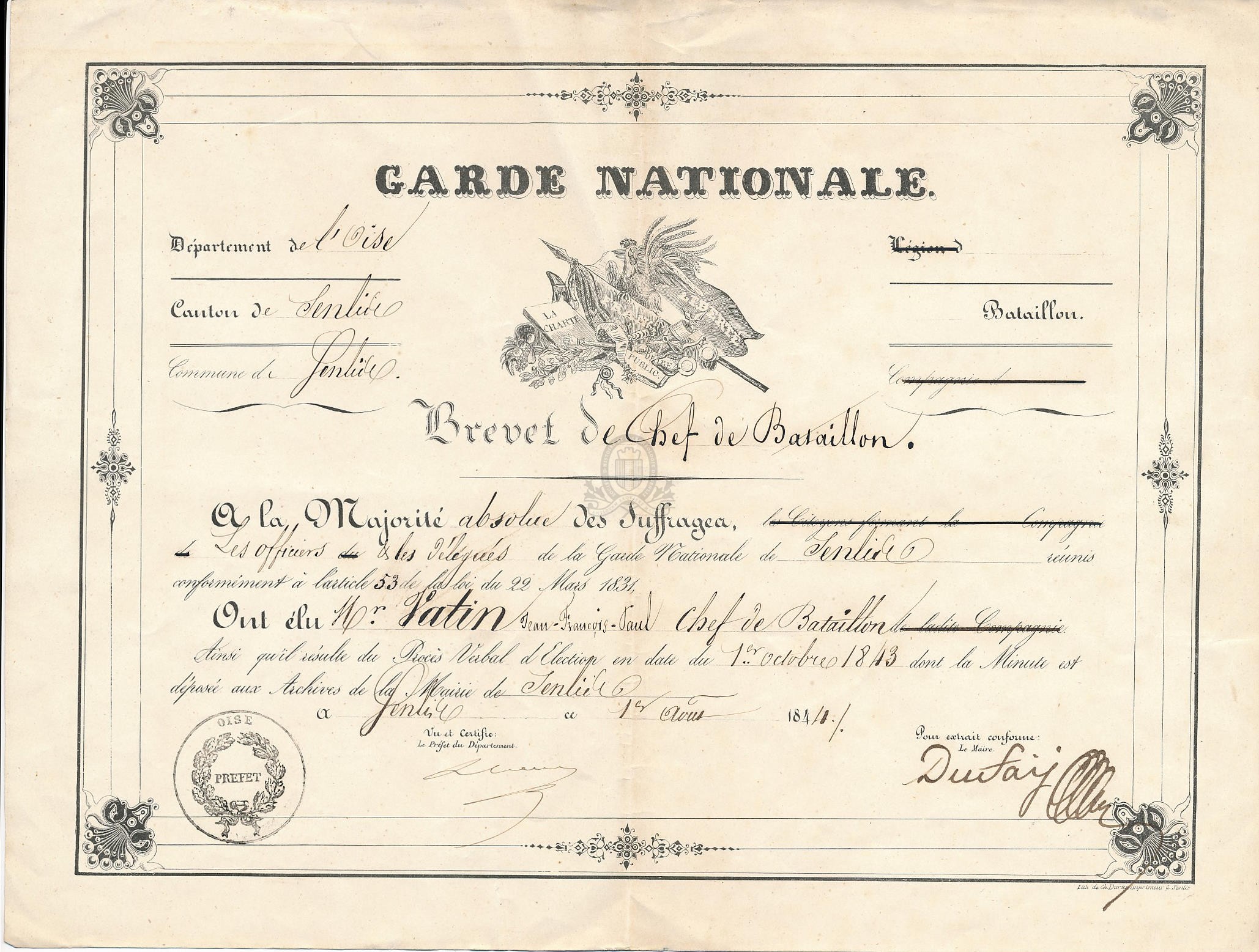 PermalinkBrevet de chef de bataillon de la Garde nationale délivré à Senlis à Mr. Vatin Jean-François, le 1er août 1844 / Ville de Senlis (1844)