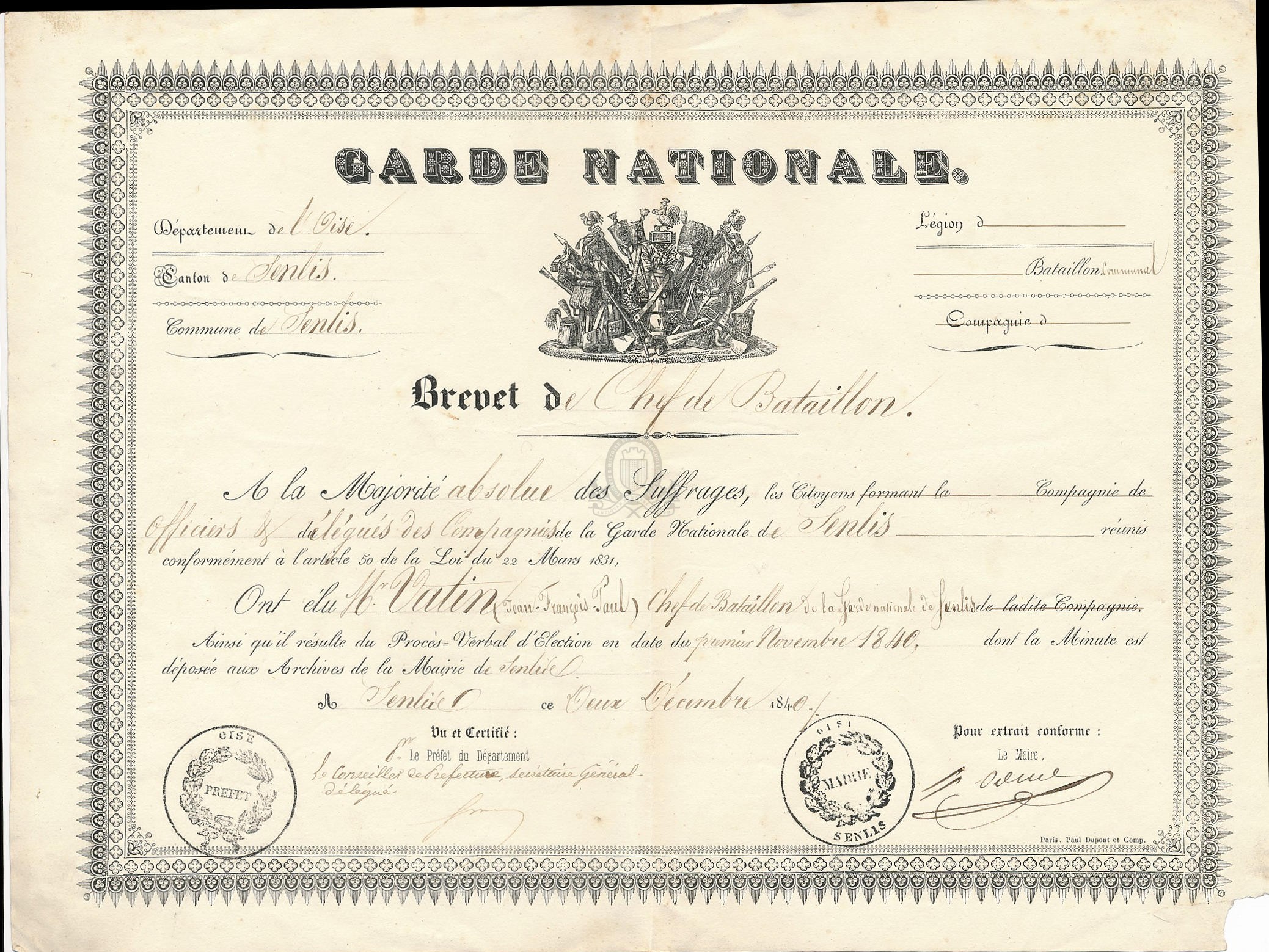 PermalinkBrevet de chef de bataillon de la Garde nationale délivré à Senlis à Mr. Vatin Jean-François, le 2 décembre 1840 / Ville de Senlis (1840)